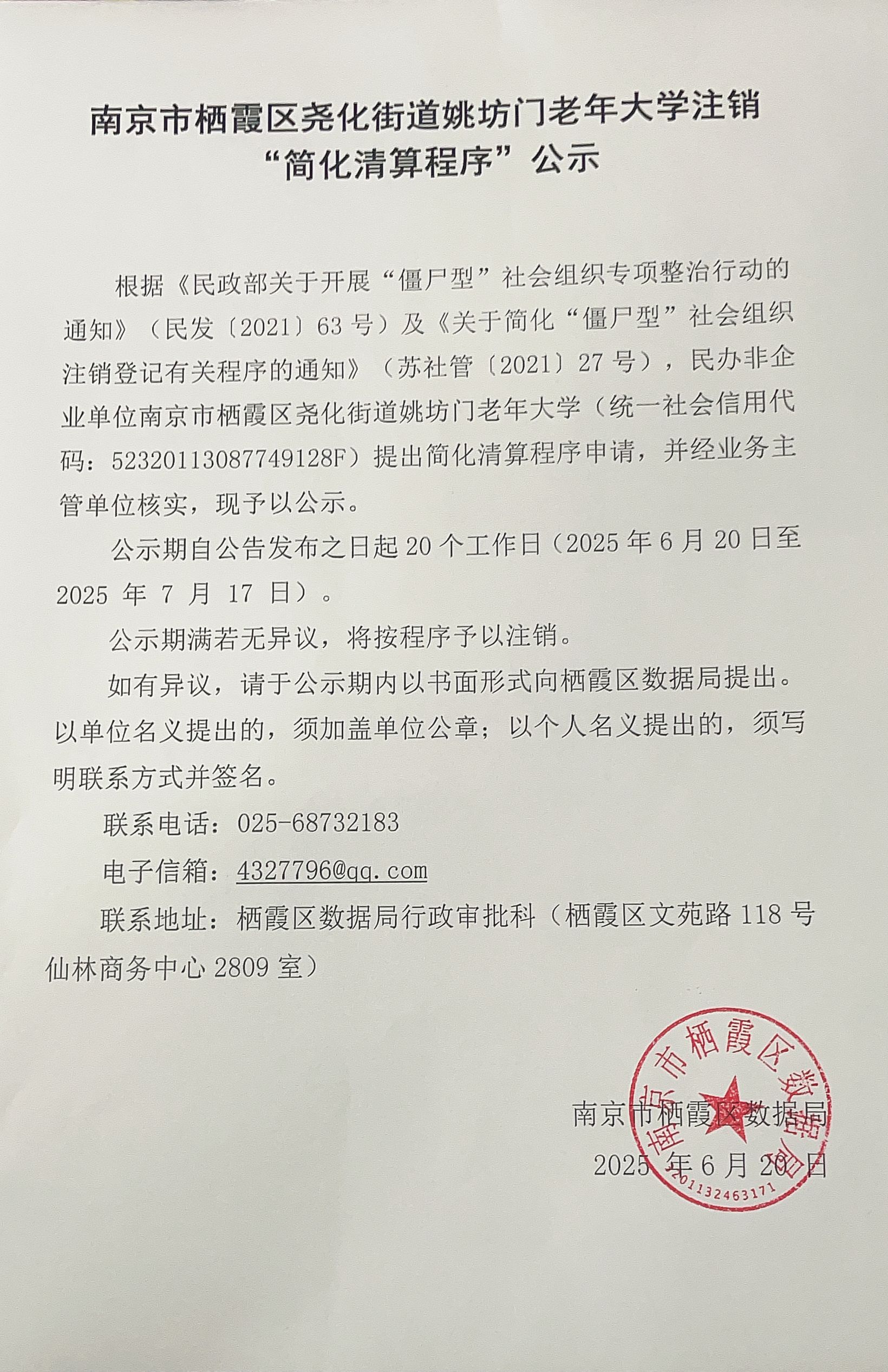 南京市棲霞區堯化街道姚坊門老年大學注銷 “簡化清算程序”公示