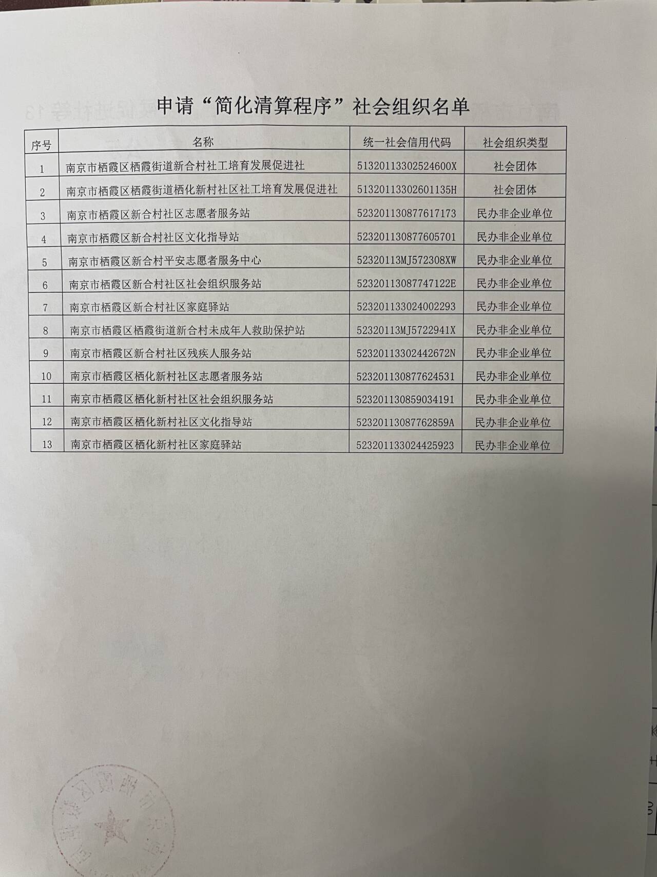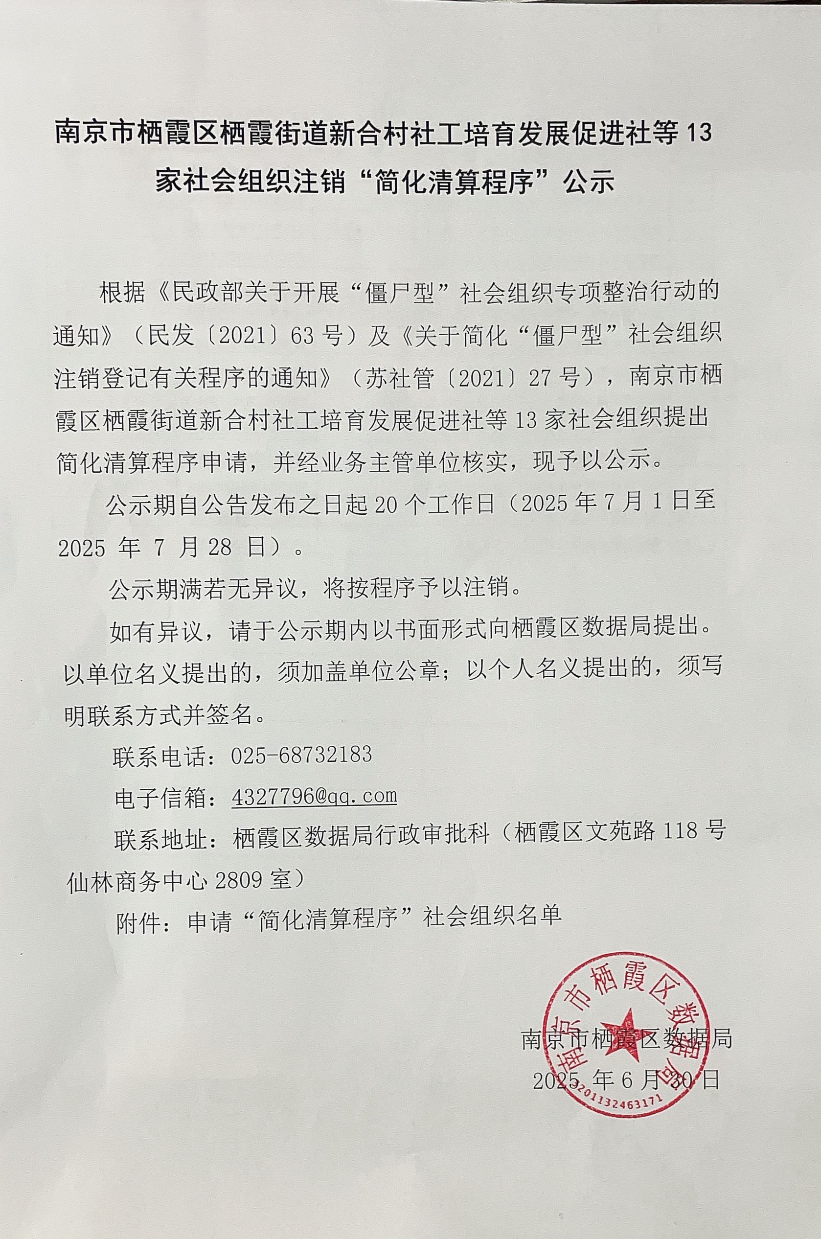 南京市棲霞區(qū)棲霞街道新合村社工培育發(fā)展促進(jìn)社等13家社會(huì)組織注銷“簡化清算程序”公示