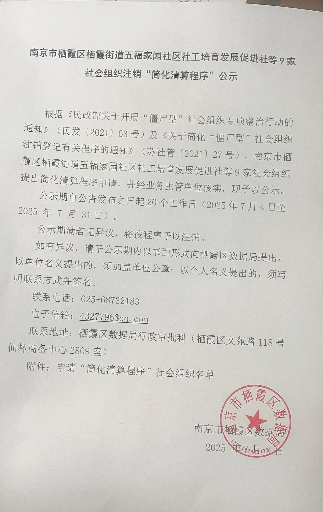 南京市棲霞區棲霞街道五福家園社區社工培育發展促進社等9家社會組織注銷“簡化清算程序”公示