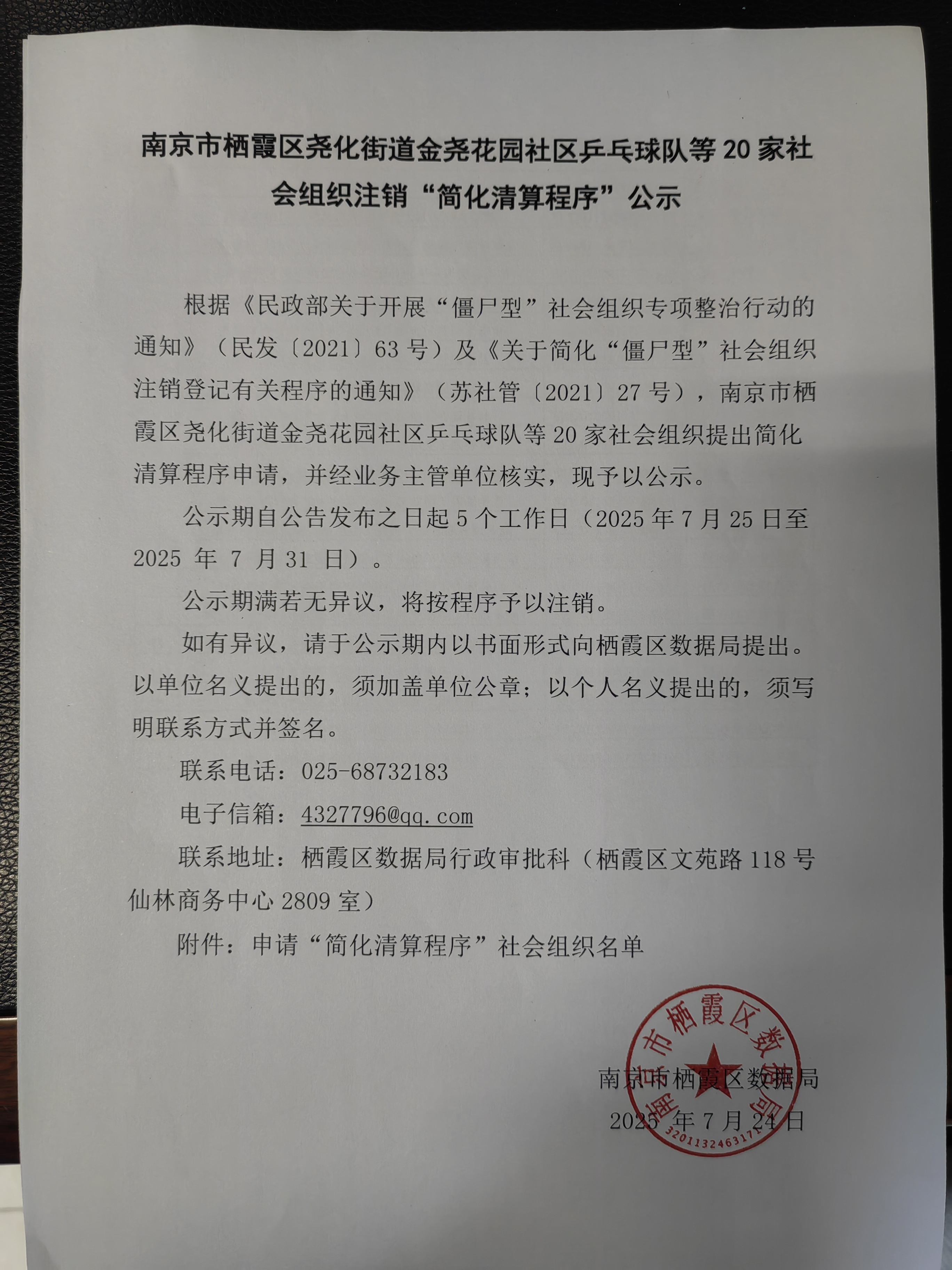 南京市棲霞區堯化街道金堯花園社區乒乓球隊等20家社會組織注銷“簡化清算程序”公示