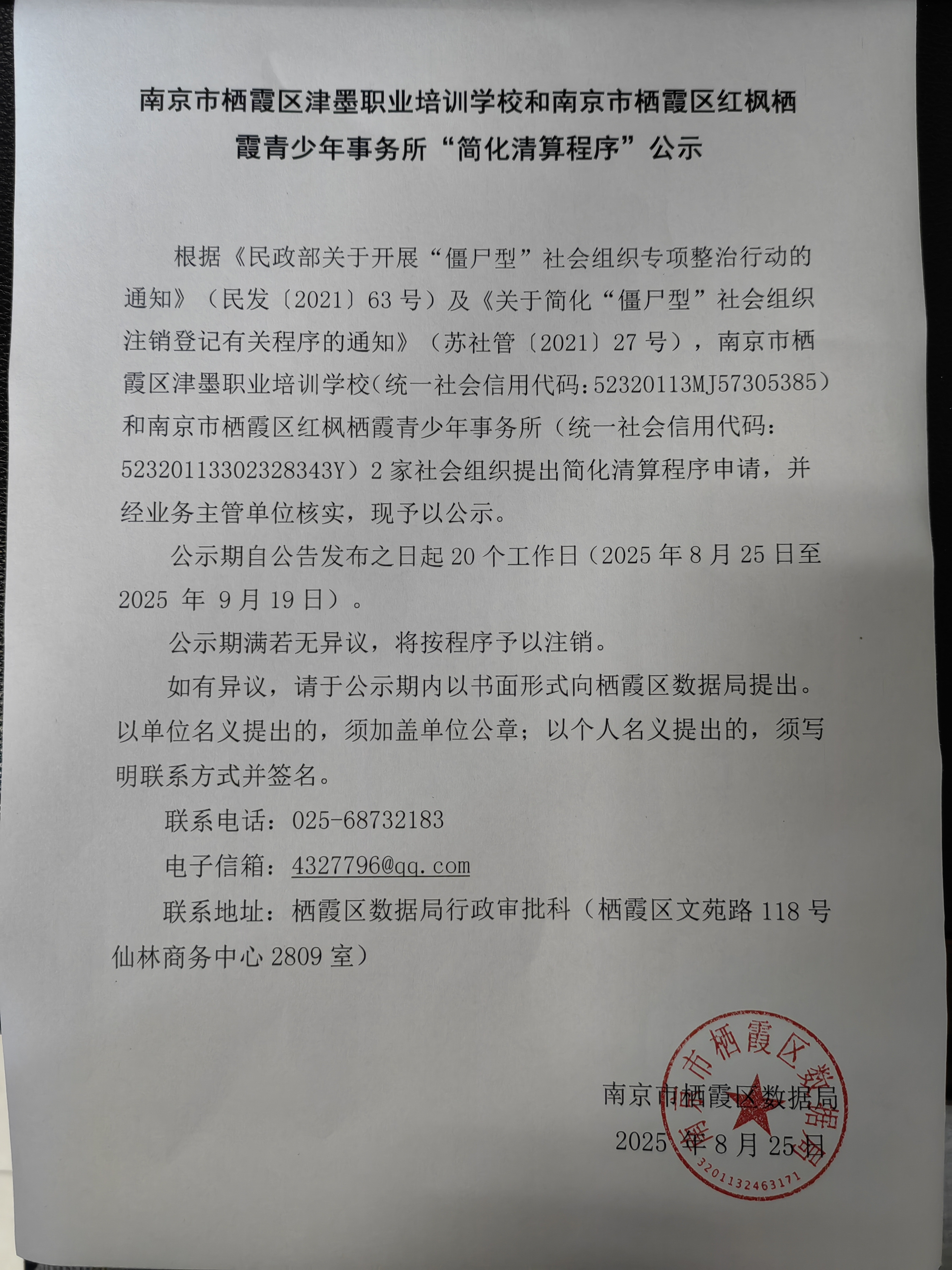 南京市棲霞區津墨職業培訓學校和南京市棲霞區紅楓棲霞青少年事務所“簡化清算程序”公示