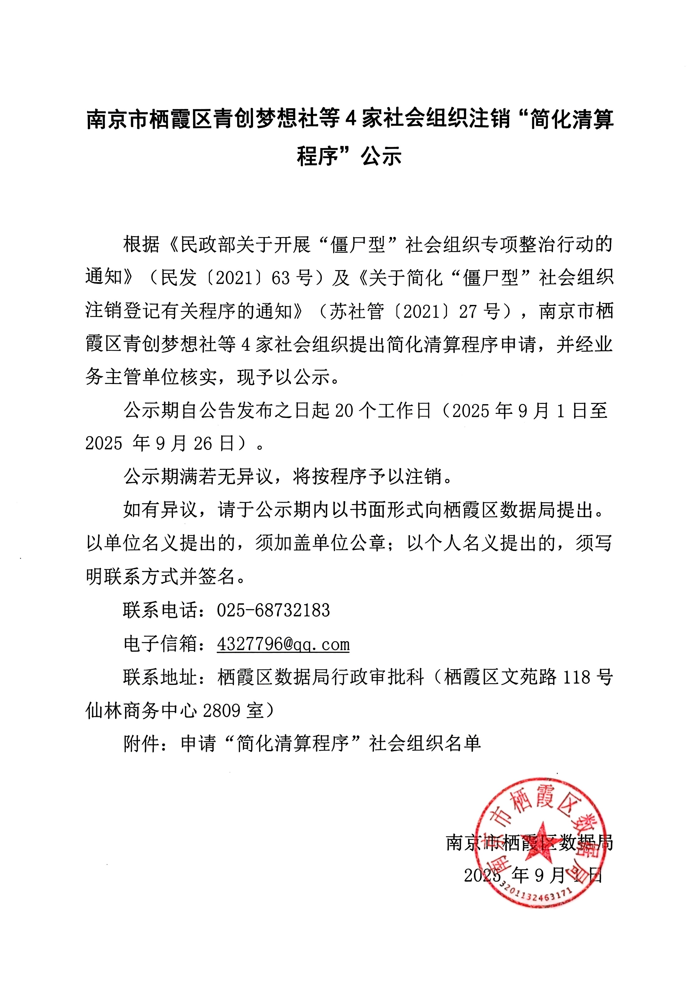 南京市棲霞區青創夢想社等4家社會組織注銷“簡化清算程序公示