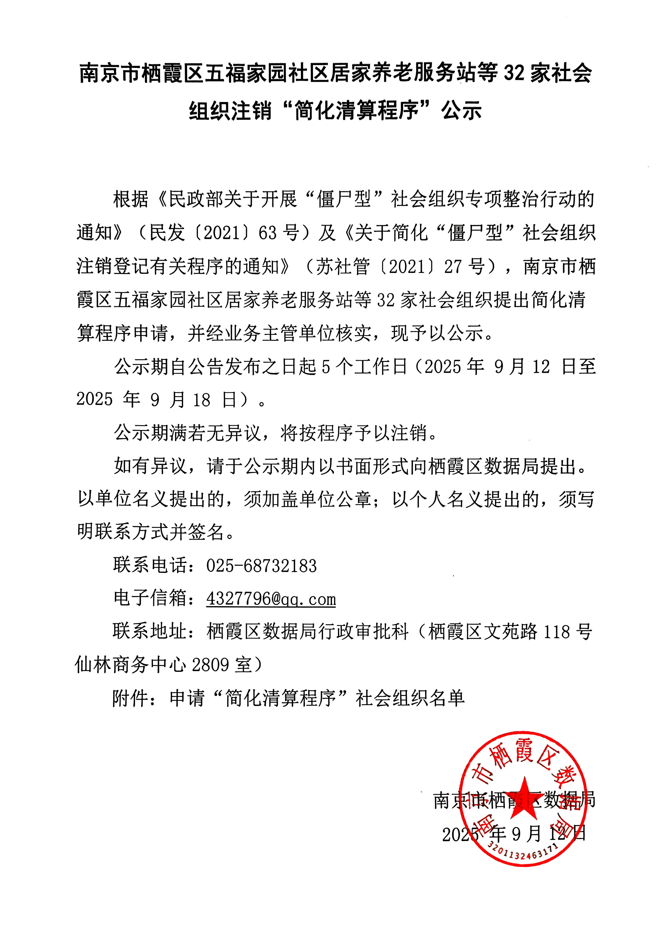 南京市棲霞區五福家園社區居家養老服務站等32家社會組織注銷“簡化清算程序”公示