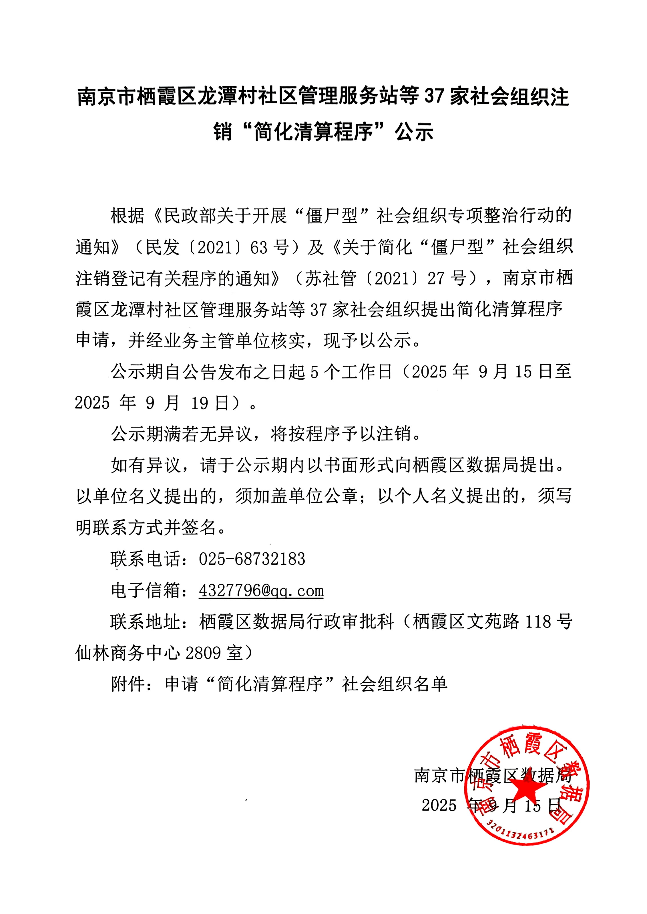 南京市棲霞區龍潭村社區管理服務站等37家社會組織注銷“簡化清算程序”公示