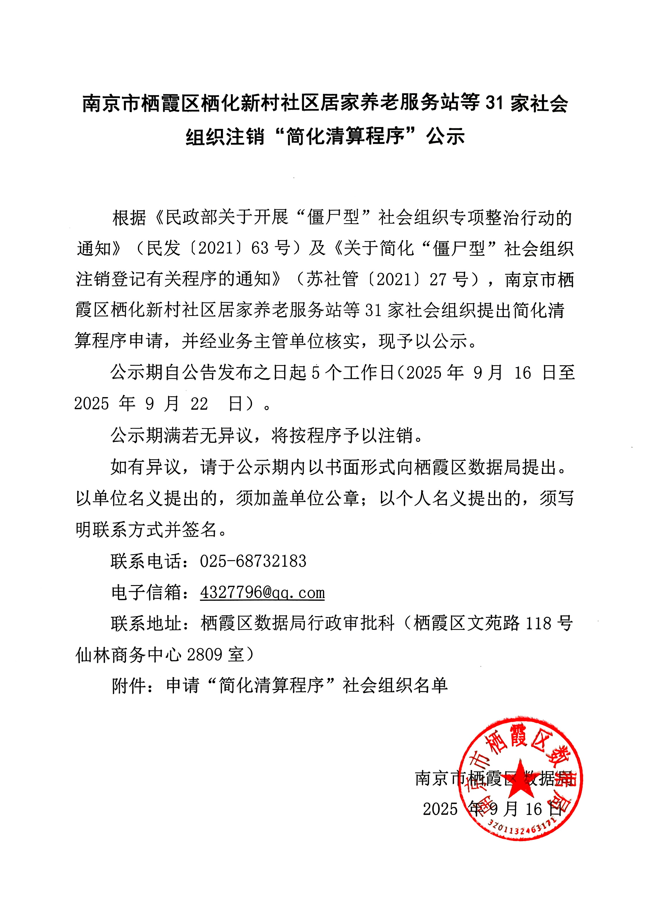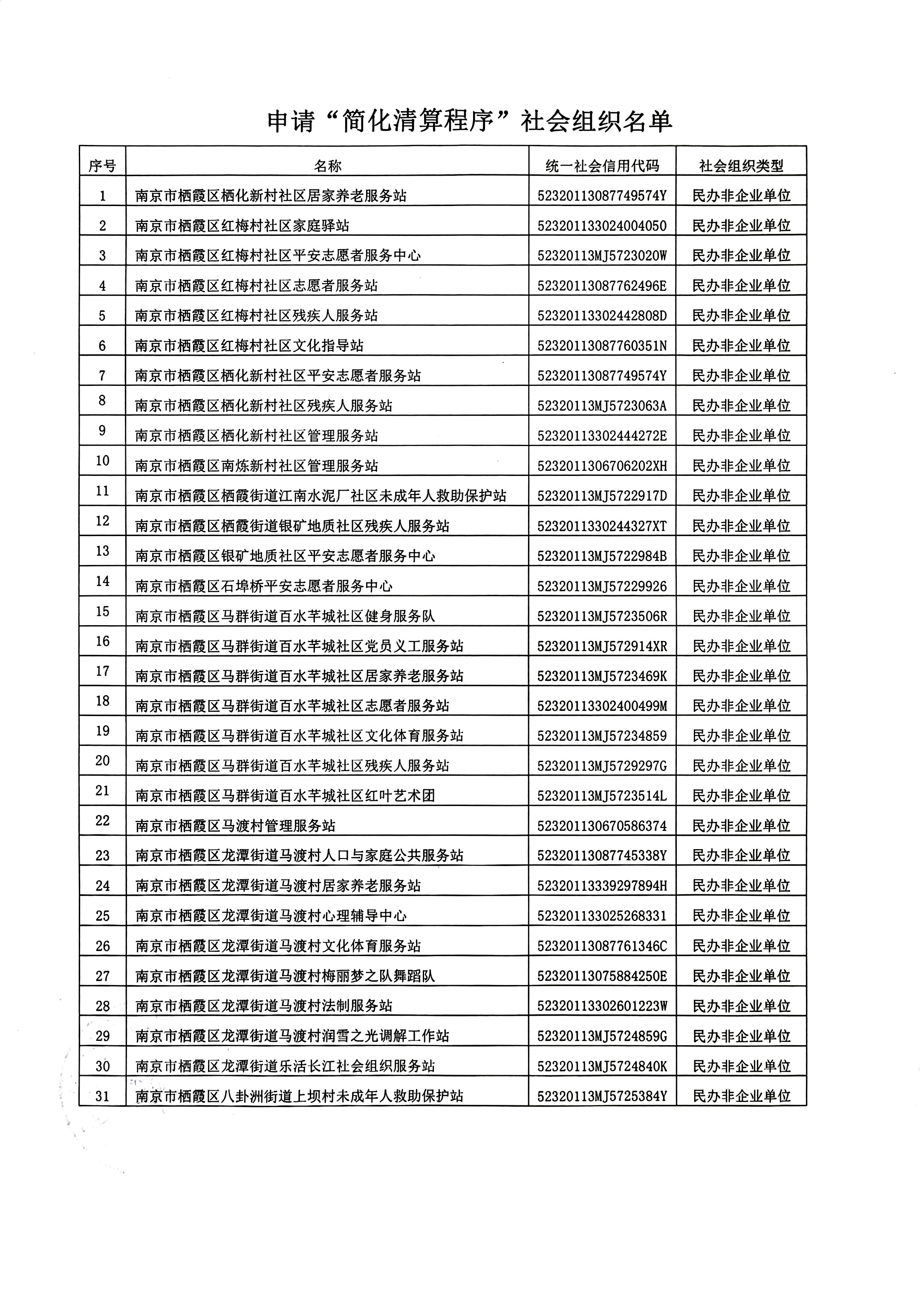 信息名稱:    南京市棲霞區(qū)棲化新村社區(qū)居家養(yǎng)老服務(wù)站等31家社會(huì)組織注銷“簡(jiǎn)化清算程序”公示