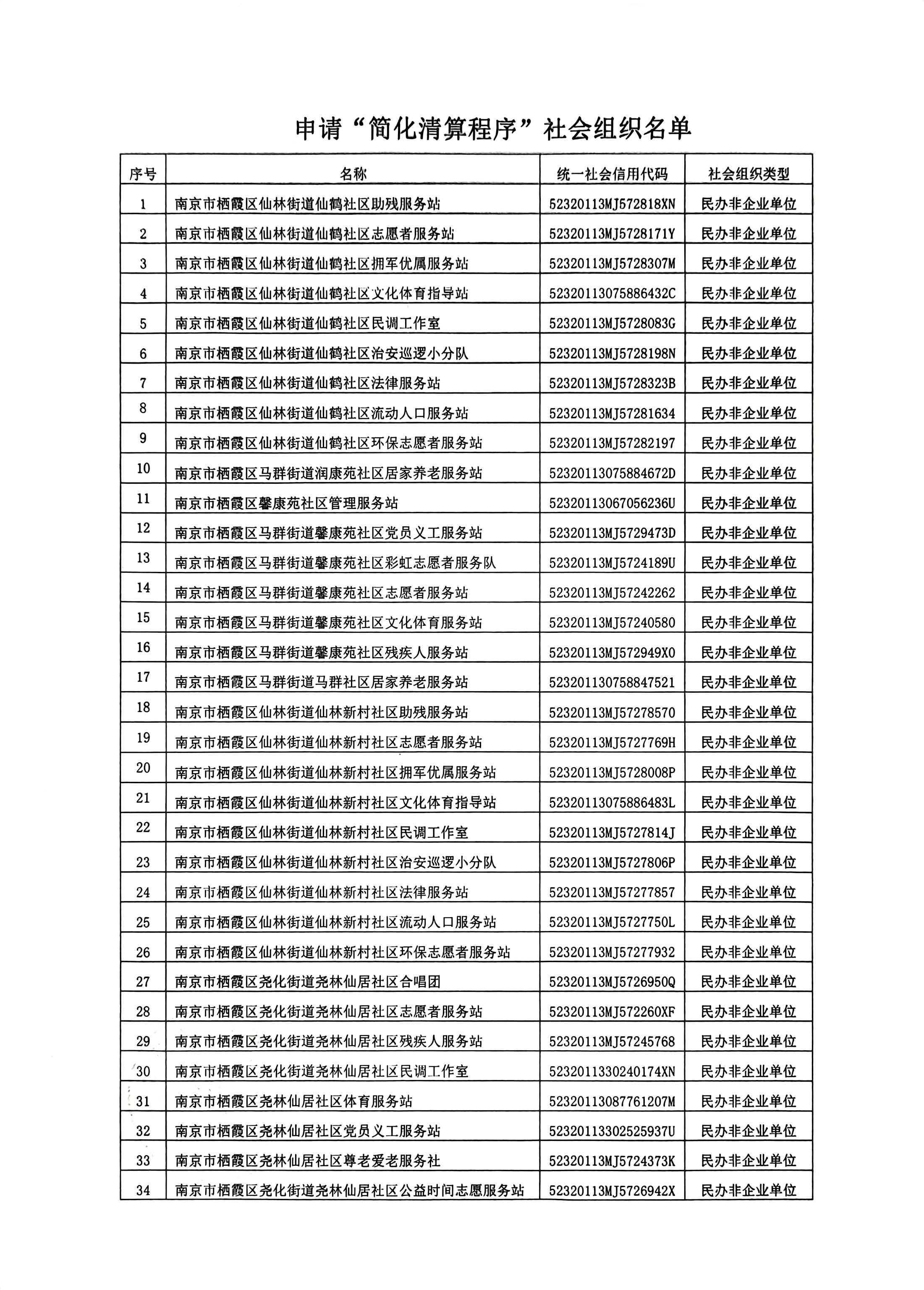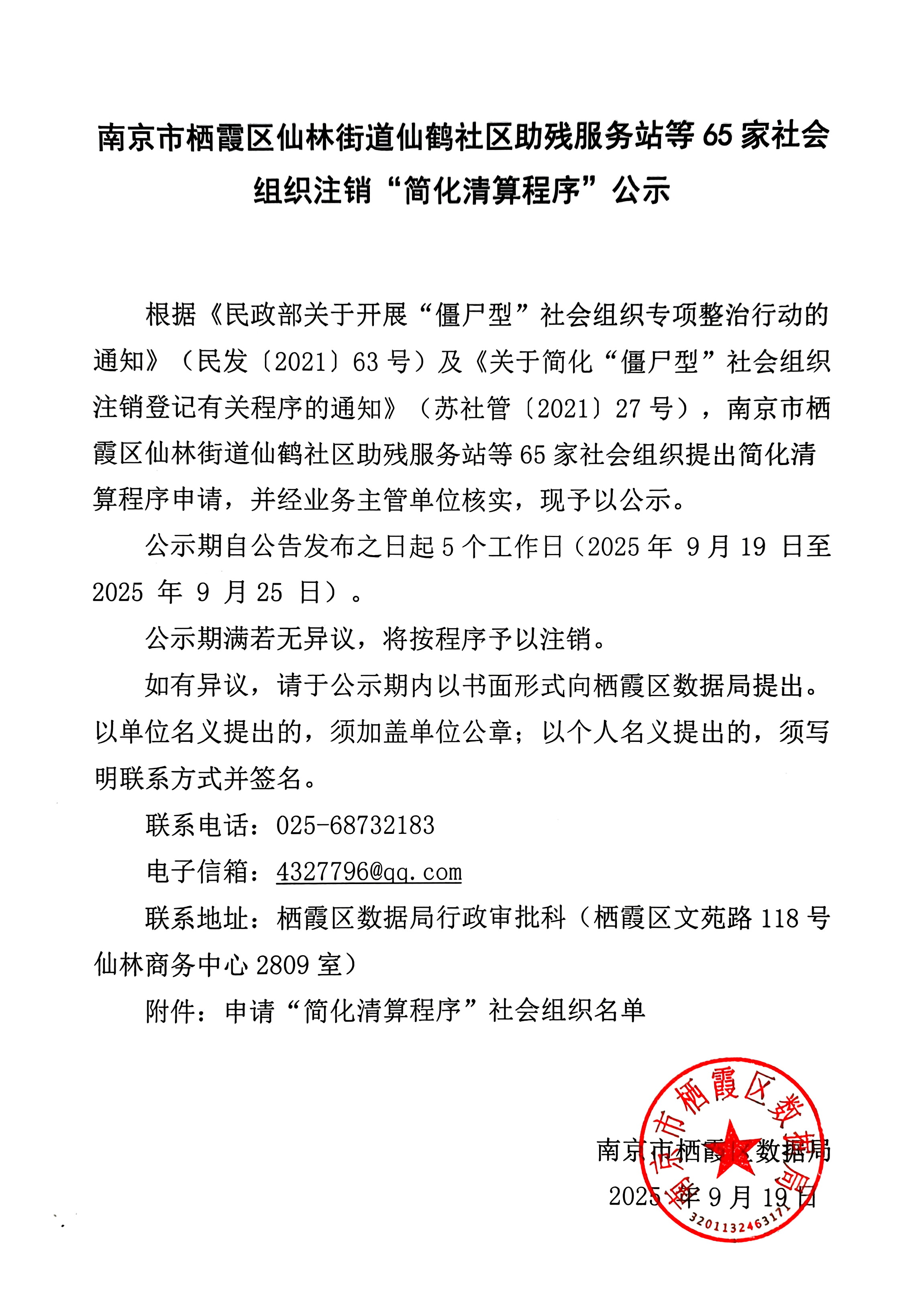 南京市棲霞區仙林街道仙鶴社區助殘服務站等65家社會組織注銷“簡化清算程序”公示
