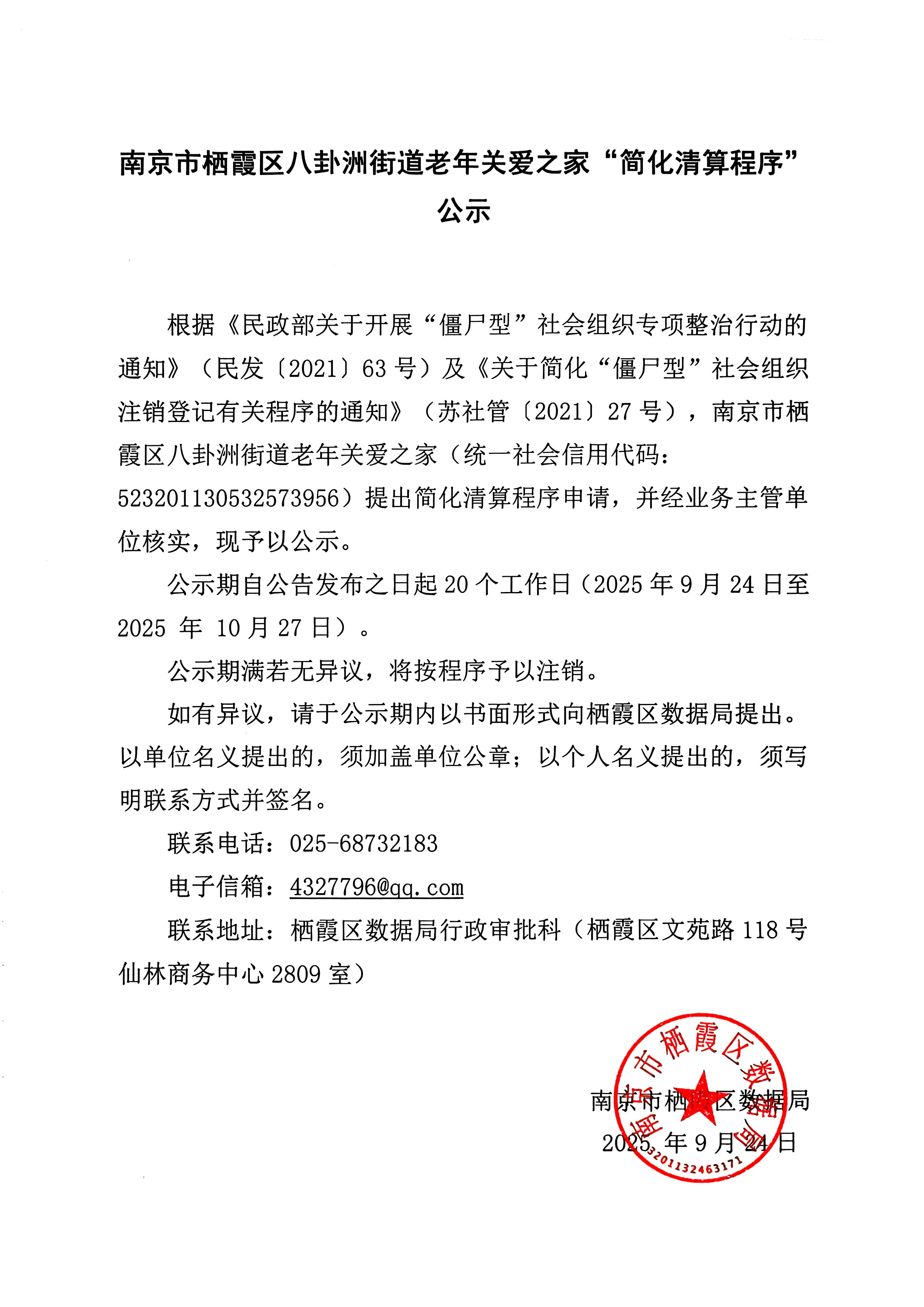 南京市棲霞區八卦洲街道老年關愛之家“簡化清算程序”公示