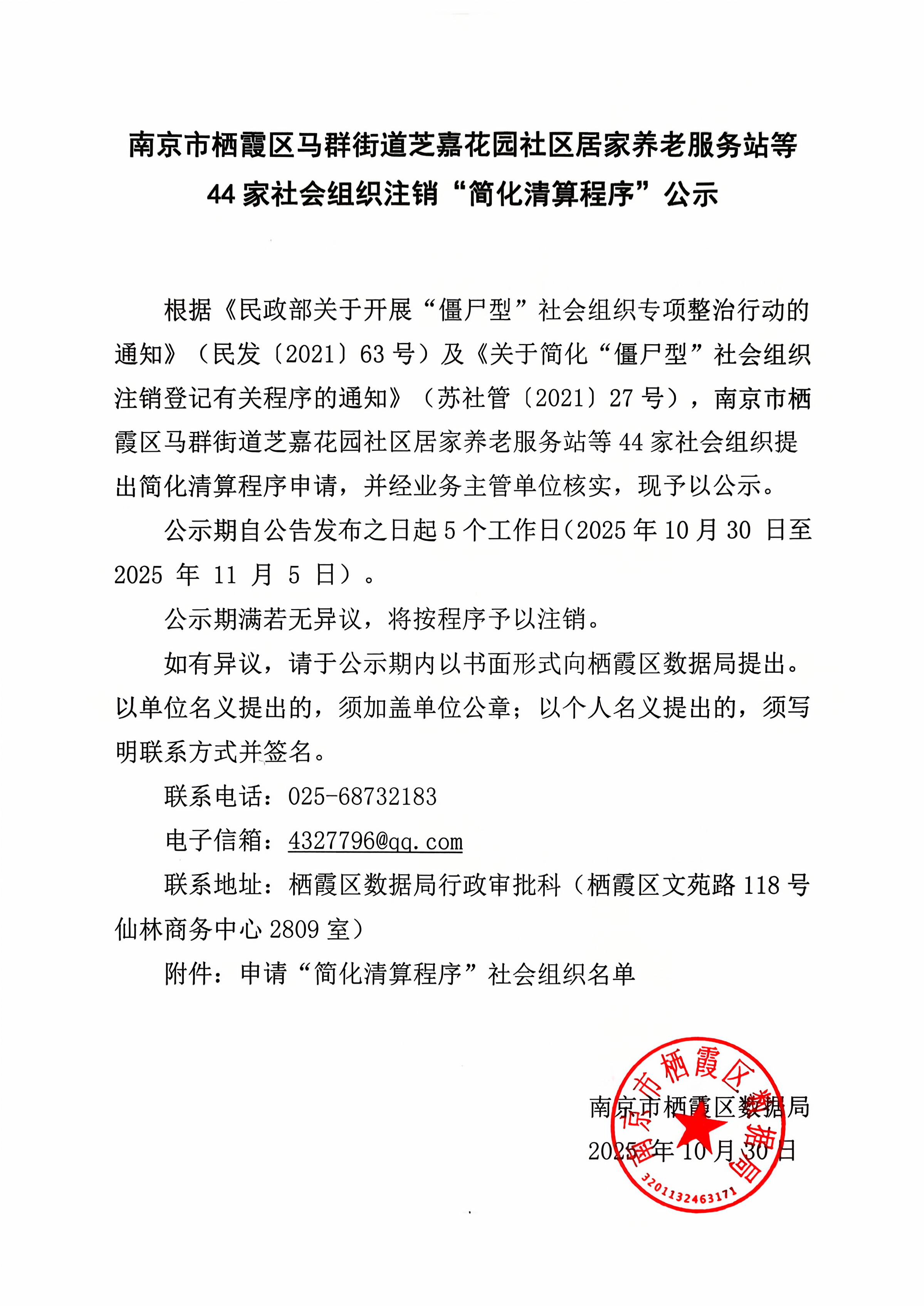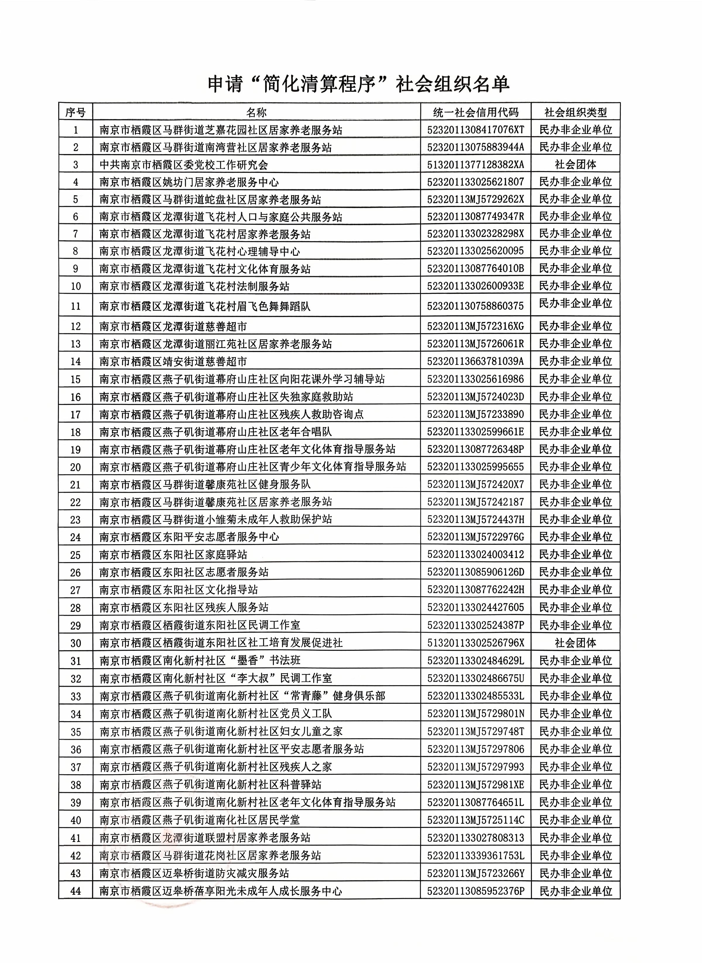 南京市棲霞區(qū)馬群街道芝嘉花園社區(qū)居家養(yǎng)老服務站等44家社會組織注銷“簡化清算程序”公示