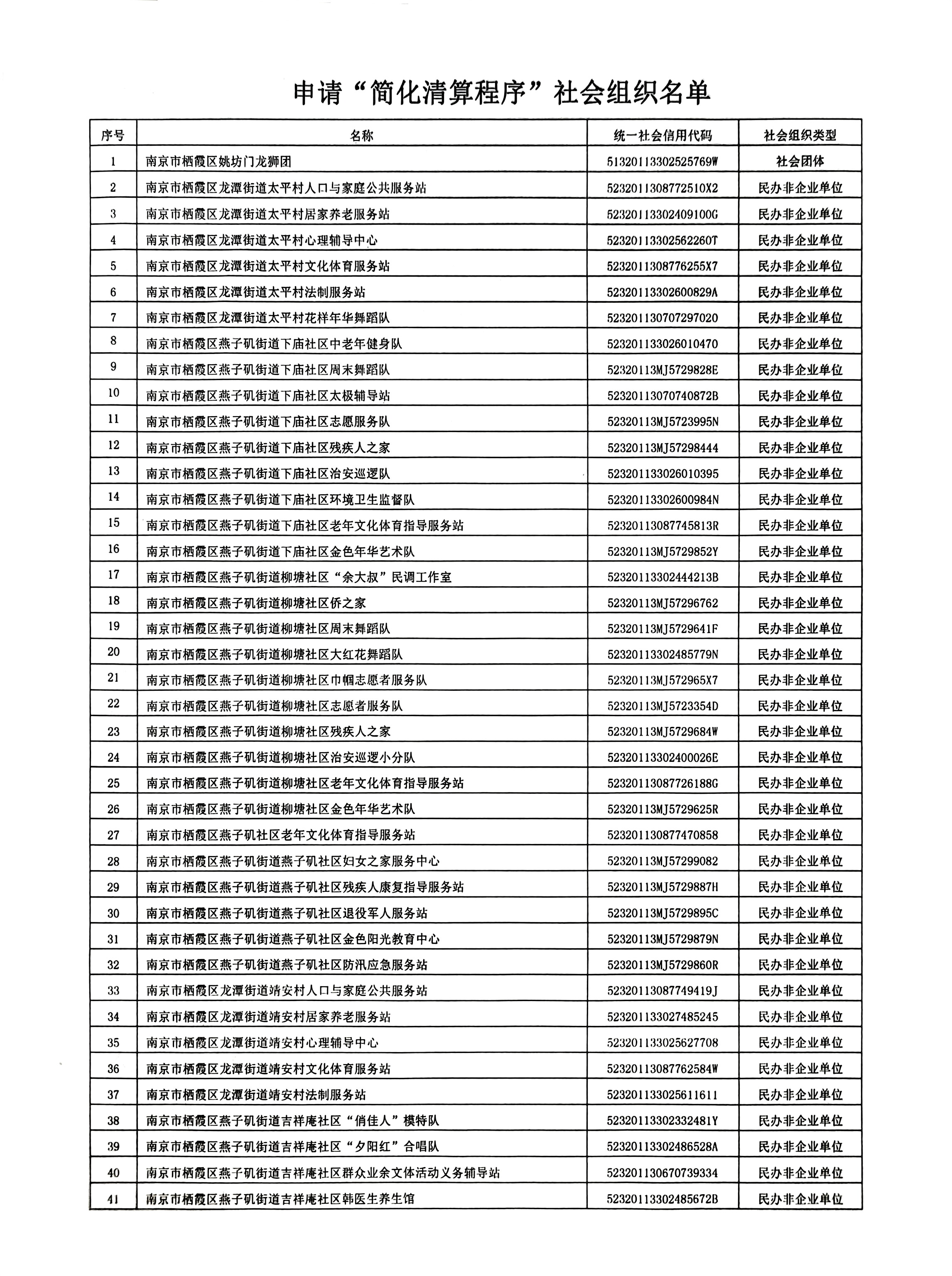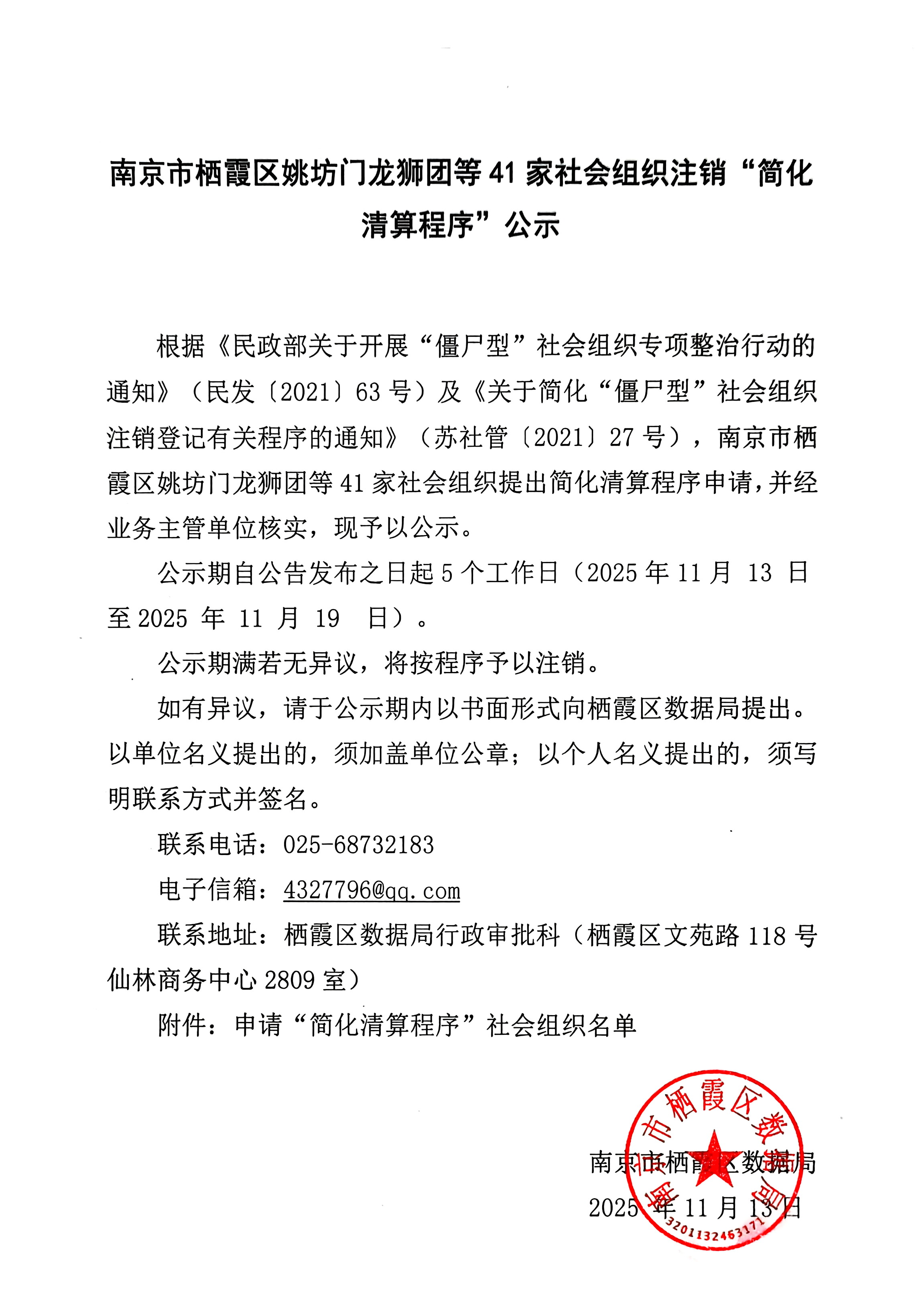 南京市棲霞區姚坊門龍獅團等41家社會組織注銷“簡化清算程序”公示