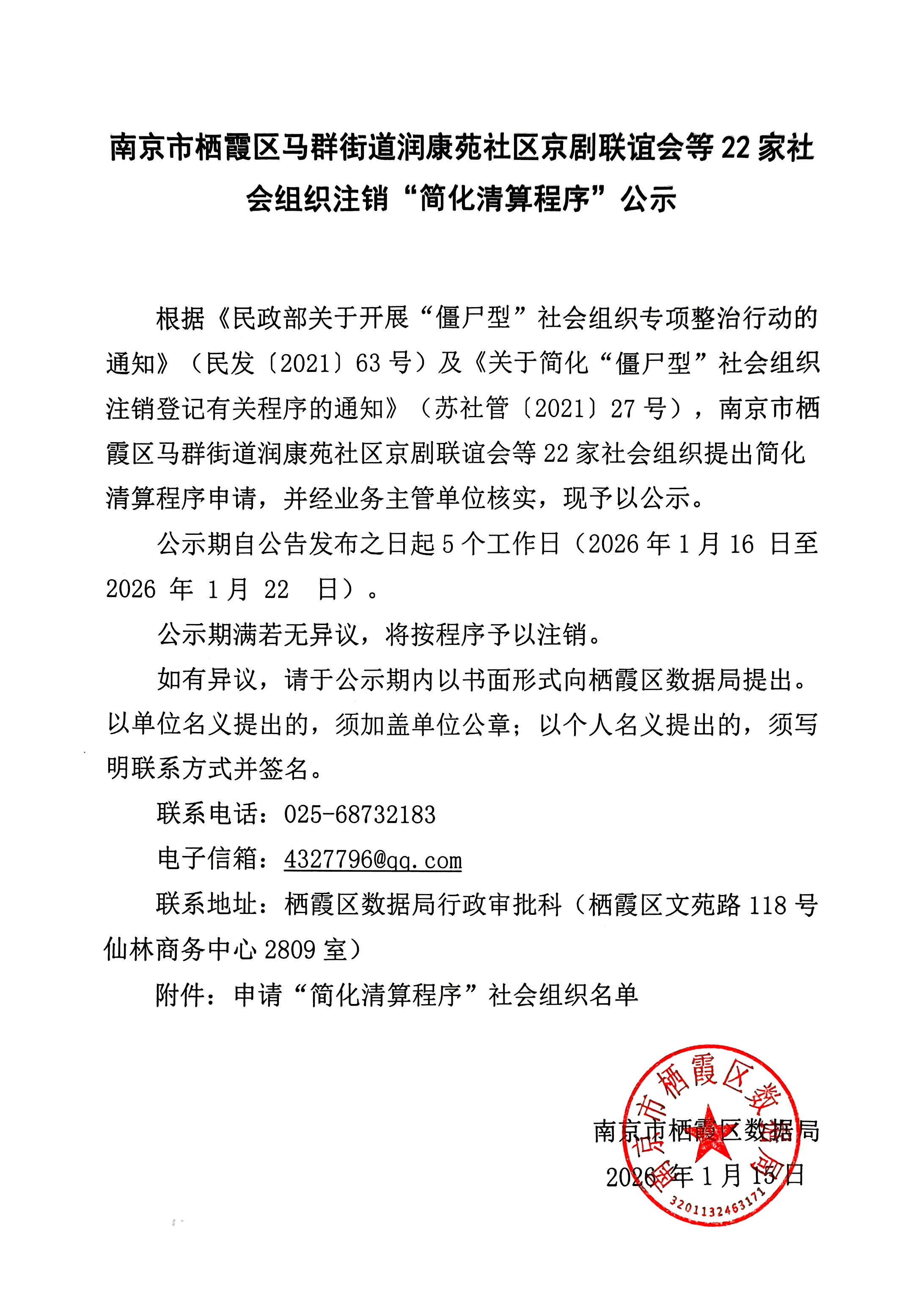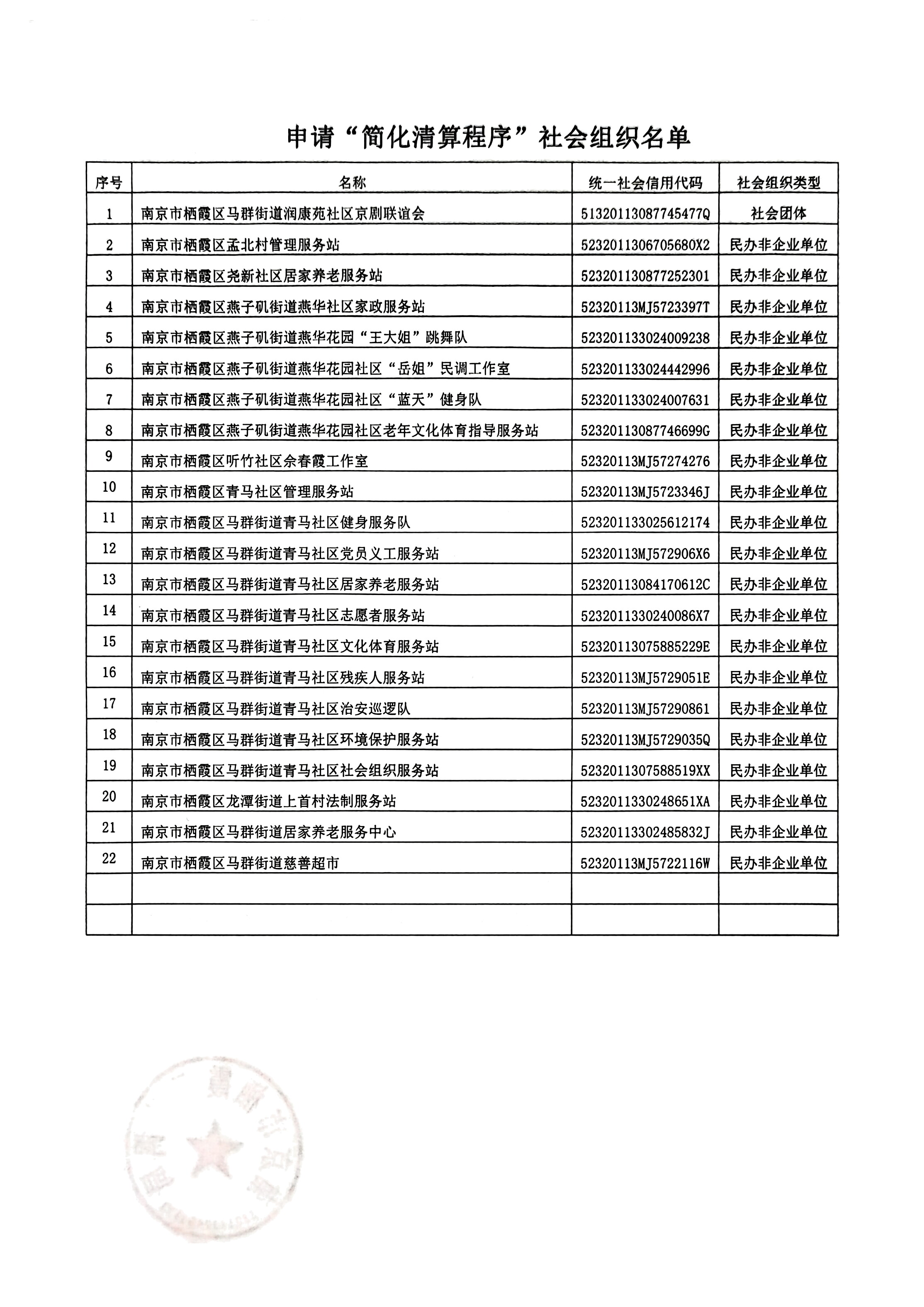 南京市棲霞區(qū)馬群街道潤康苑社區(qū)京劇聯(lián)誼會等22家社會組織注銷“簡化清算程序”公示