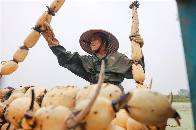 十月,秋高氣爽。走進棲霞區龍潭街道陳店村,目之所及盡是藕塘好景。只見村民們身著緊身的橡膠防水服,弓著身子半蹲在水中,一邊用腳緩緩地向前蹚水,一邊用手往藕田里不斷摸索,他們手里還抓著高壓水槍,在確定目標后,只見他們對準泥下成熟的蓮藕輕輕一沖,動作嫻熟而有力。沒一會兒,一根根潔白如玉、肥碩飽滿的蓮藕便應聲而出,滿是泥土的芬芳與豐收的喜悅。