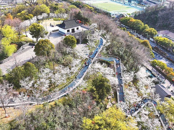 324日,南京棲霞區燕子磯觀音門公園的“櫻花天梯”進入最佳觀賞季,“之”字形樓梯兩側,櫻花沿著山體錯落綻放,爛漫的花朵與蜿蜒的階梯相映成趣,仿佛通往春天的夢幻通道,吸引眾多市民前來打卡。