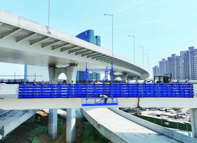 近日,施工人員在仙新路過江通道棲霞互通匝道進行地面道路、現澆梁、鋼箱梁、護欄及橋面附屬設施的施工。棲霞互通項目采用直連式互通立交模式,包含地面輔路、地下一層隧道及高架橋,八條定向匝道連接棲霞大道與仙新路高架。項目建成后將顯著縮短棲霞大道至江北新區的車程。