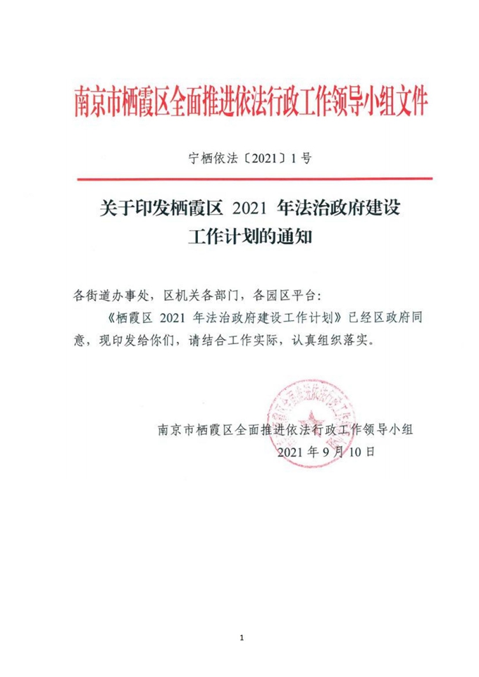 關于印發棲霞區2021年法治政府建設工作計劃的通知