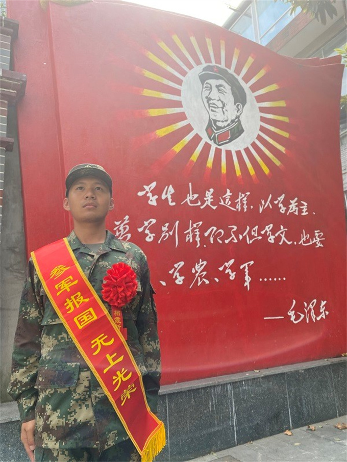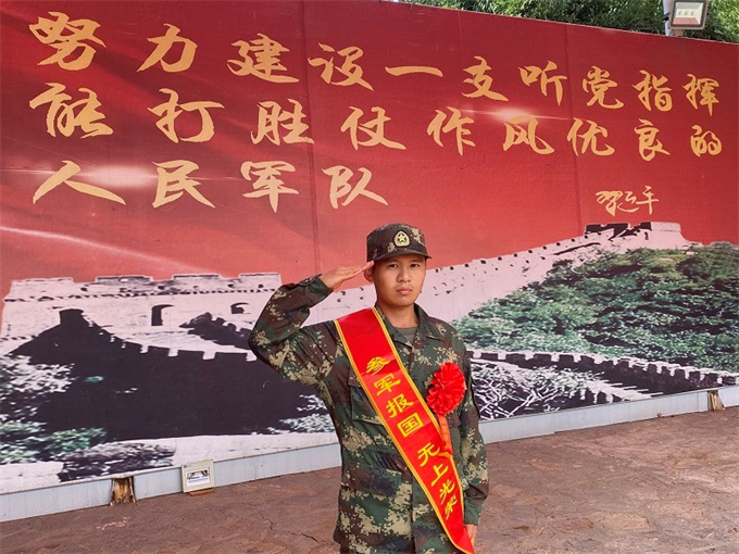 9月26日一大早,新兵馬俊浩穿戴整齊一身新軍服,背著寫有“參軍報國 無上光榮”的綬帶,胸帶大紅花,滿懷激動地踏上前往軍旅生活新征程。