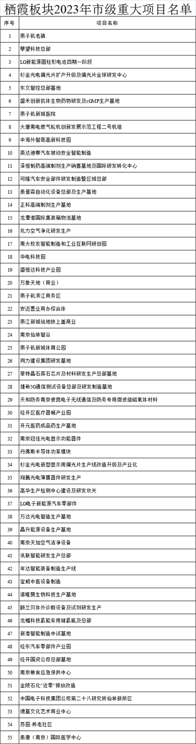 棲霞板塊55個實施類項目名單