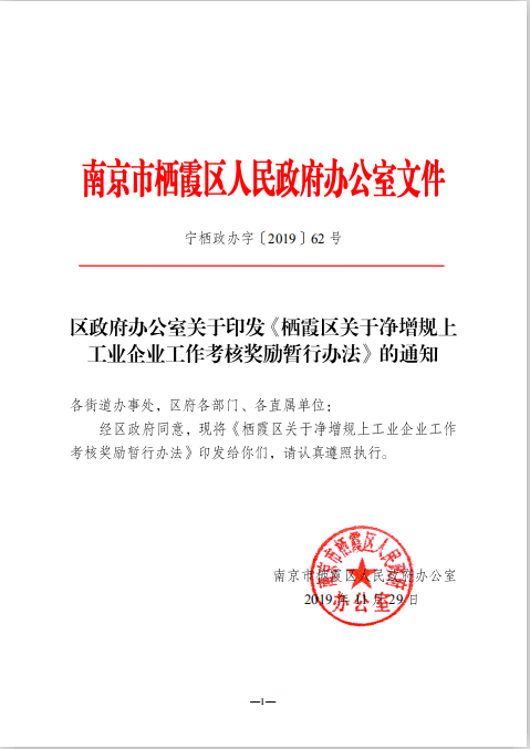 區政府辦公室關于印發《棲霞區關于凈增規上工業企業工作考核獎勵暫行辦法》的通知