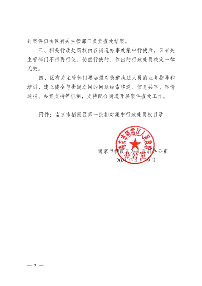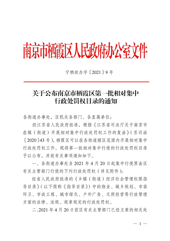 關(guān)于公布南京市棲霞區(qū)第一批相對集中行政處罰權(quán)目錄的通知