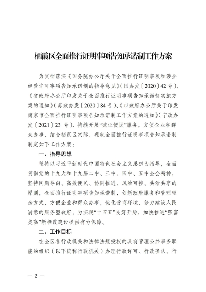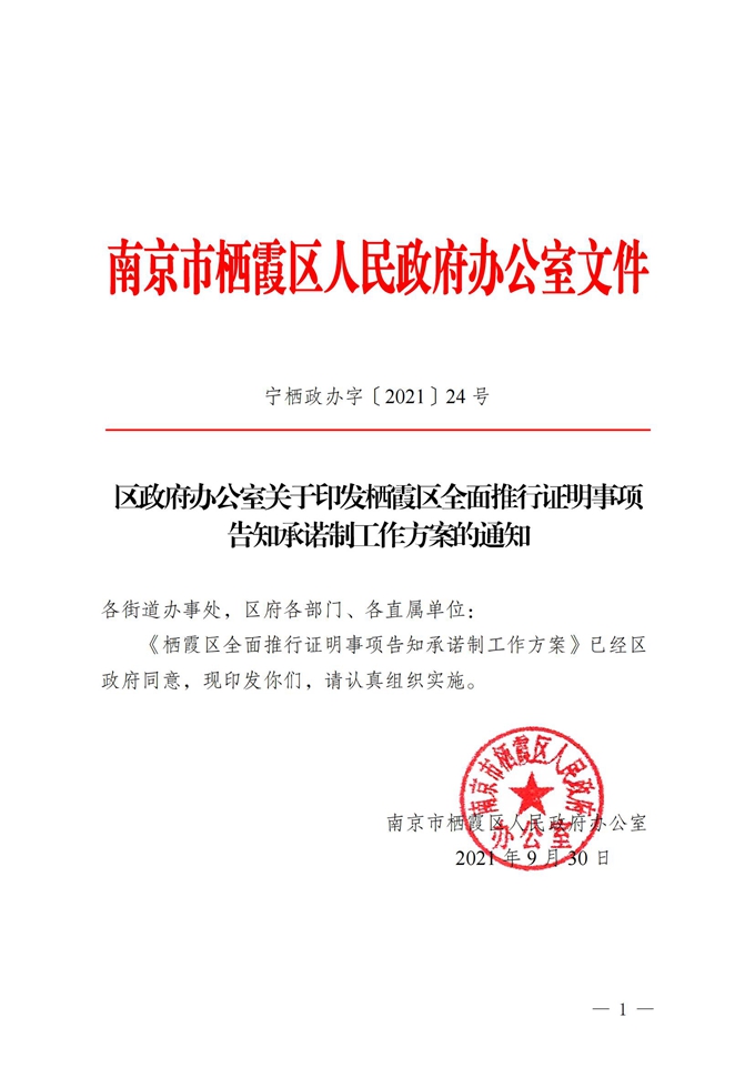 區(qū)政府辦公室關(guān)于印發(fā)《棲霞區(qū)全面推行證明事項(xiàng)告知承諾制工作方案》的通知