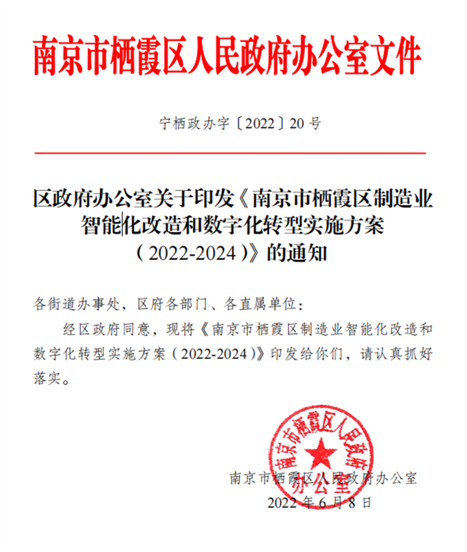 寧棲政辦字〔2022〕20號 區政府辦公室關于印發《南京市棲霞區制造業智能化改造和數字化轉型實施方案(2022-2024)》的通知