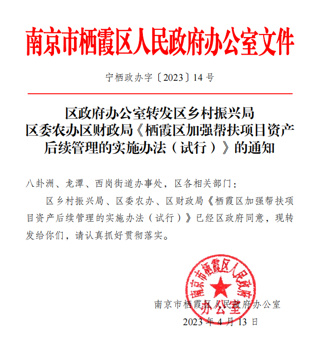 區(qū)政府辦公室轉(zhuǎn)發(fā)區(qū)鄉(xiāng)村振興局區(qū)委農(nóng)辦區(qū)財政局《棲霞區(qū)加強(qiáng)幫扶項目資產(chǎn)后續(xù)管理的實施辦法(試行)》的通知
