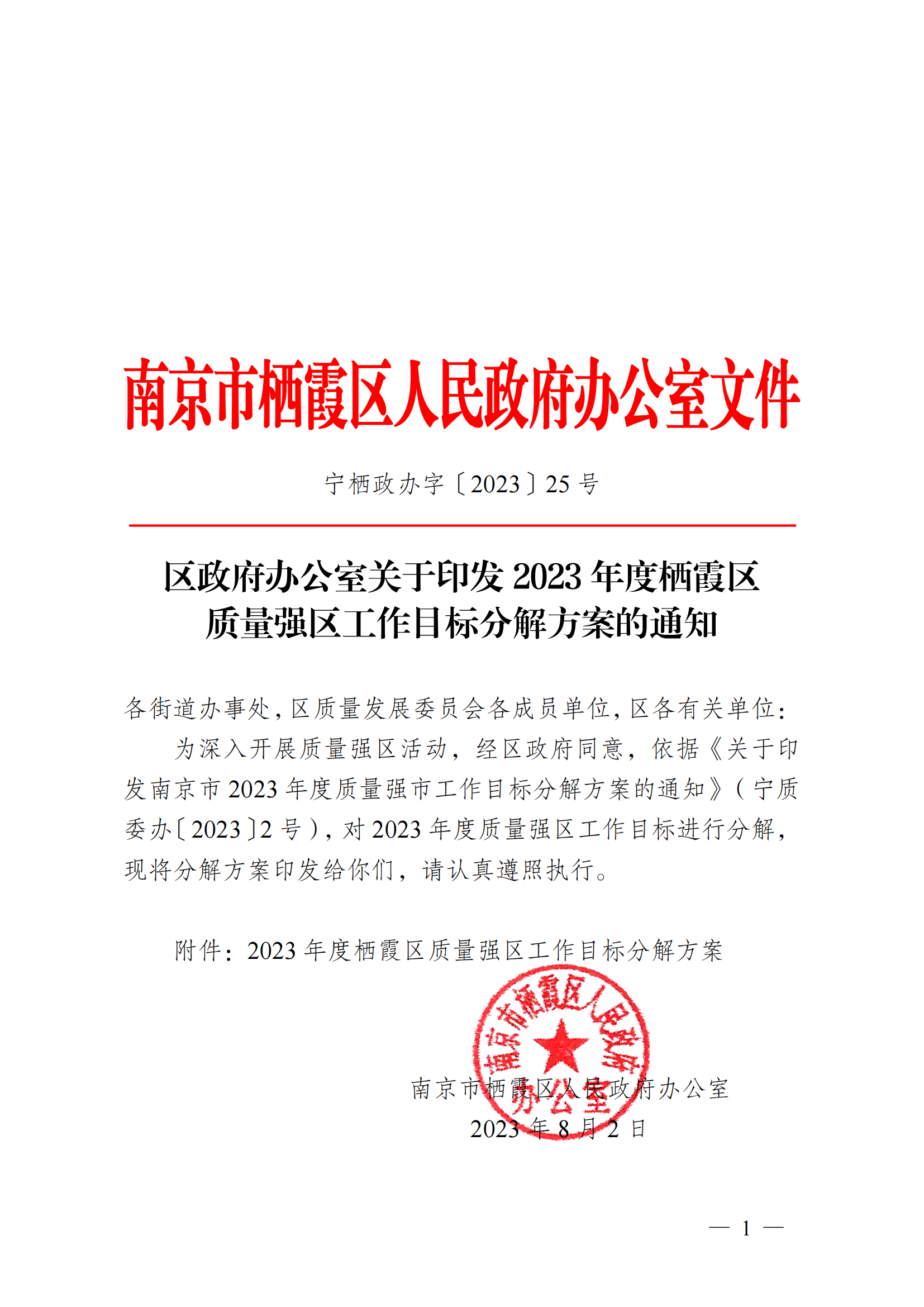 寧棲政辦字〔2023〕25號 區(qū)政府辦公室關(guān)于印發(fā)2023年度棲霞區(qū)質(zhì)量強區(qū)分解目標(biāo)