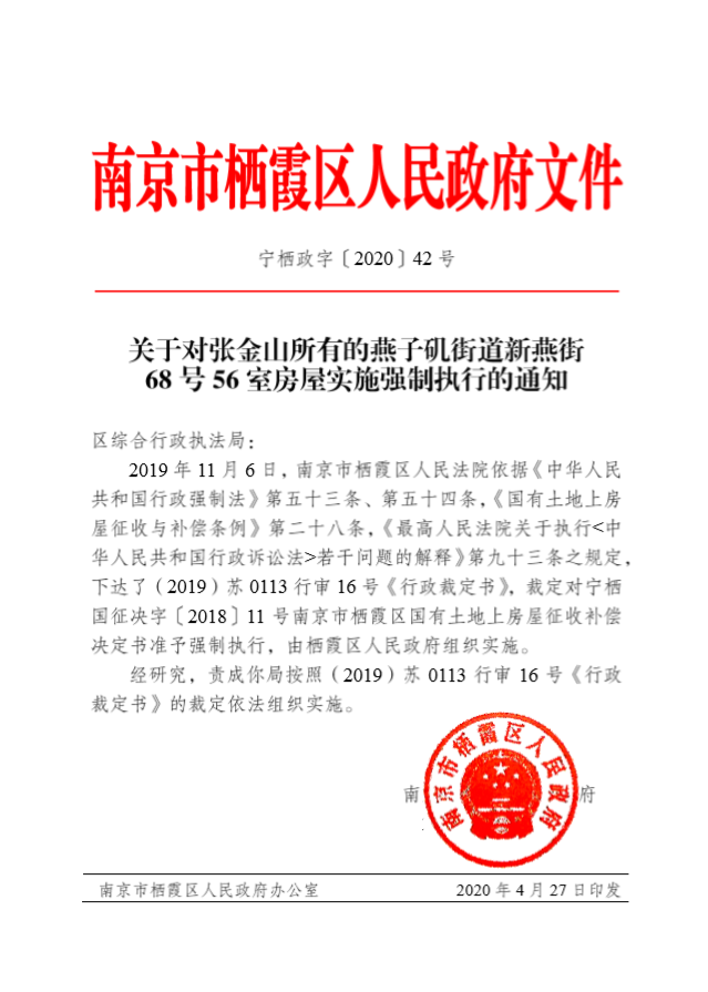 關于對張金山所有的燕子磯新燕街68號56室房屋強制執行的通知