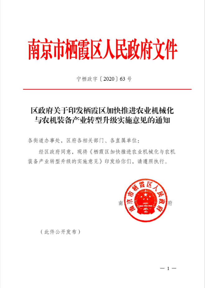 關于印發《棲霞區農業機械化和農機裝備產業轉型升級實施措施》的通知