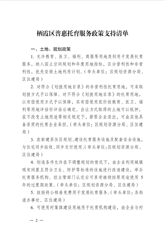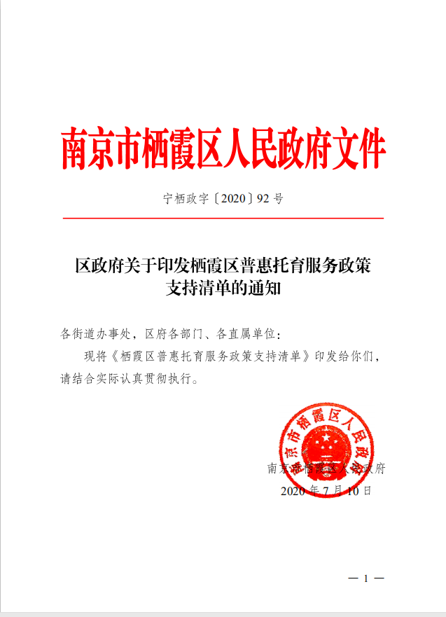 區(qū)政府關(guān)于印發(fā)棲霞區(qū)普惠托育服務(wù)政策支持清單的通知