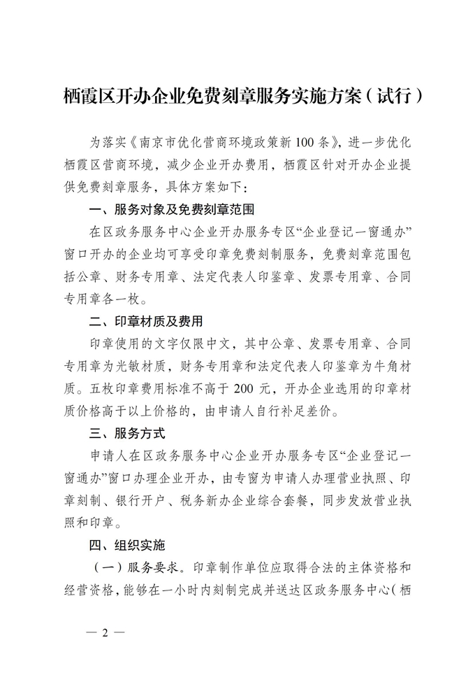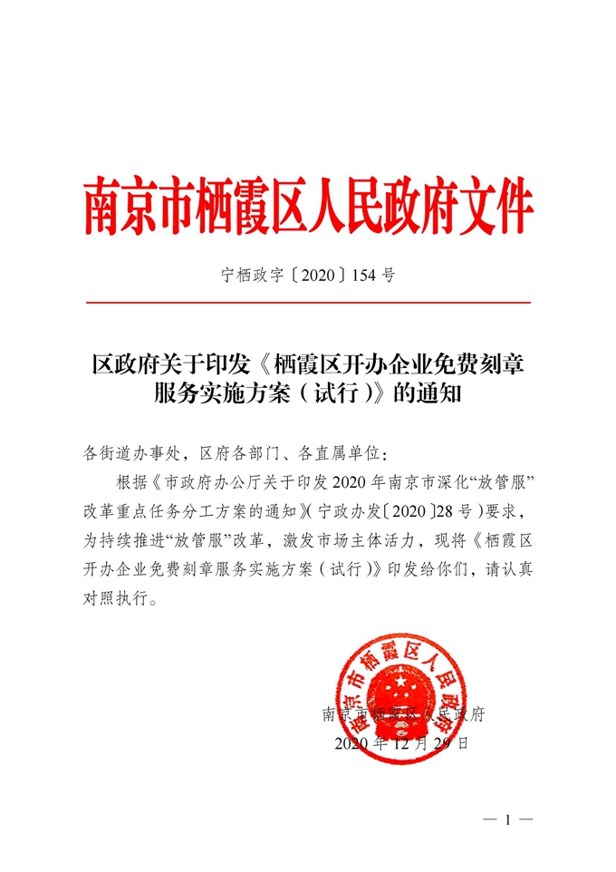 區政府關于印發《棲霞區開辦企業免費刻章服務實施方案(試行)》的通知