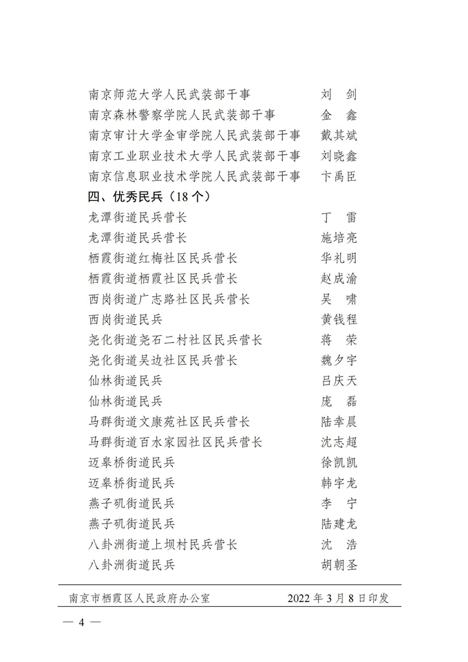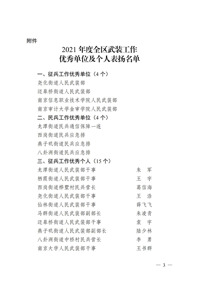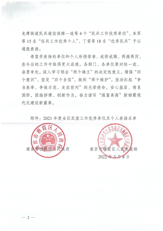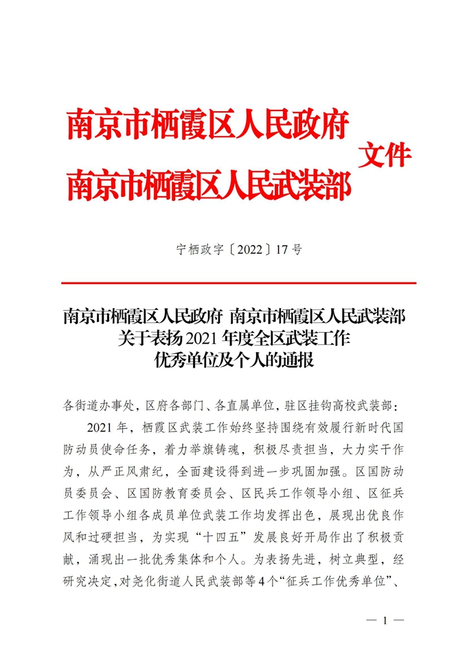 南京市棲霞區人民政府 南京市棲霞區人民武裝部 關于表揚2021年度全區武裝工作優秀單位及個人的通報
