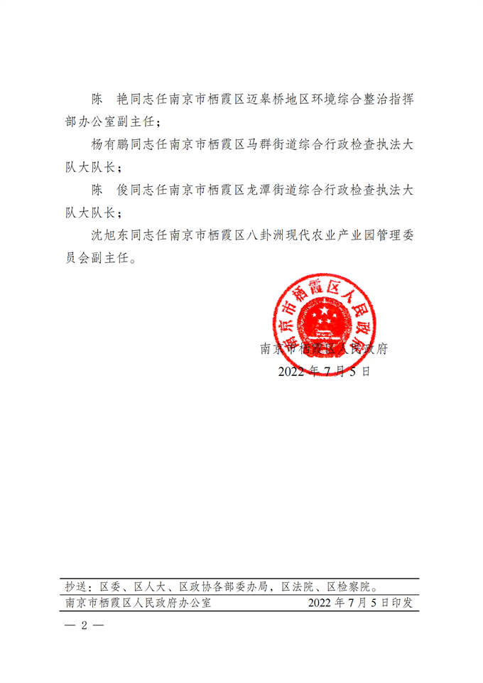 寧棲政字〔2022〕120 號 南京市棲霞區人民政府關于惠學浩等同志任職的通知