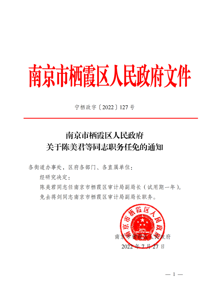 寧棲政字〔2022〕127號(hào) 南京市棲霞區(qū)人民政府關(guān)于陳美君等同志職務(wù)任免的通知
