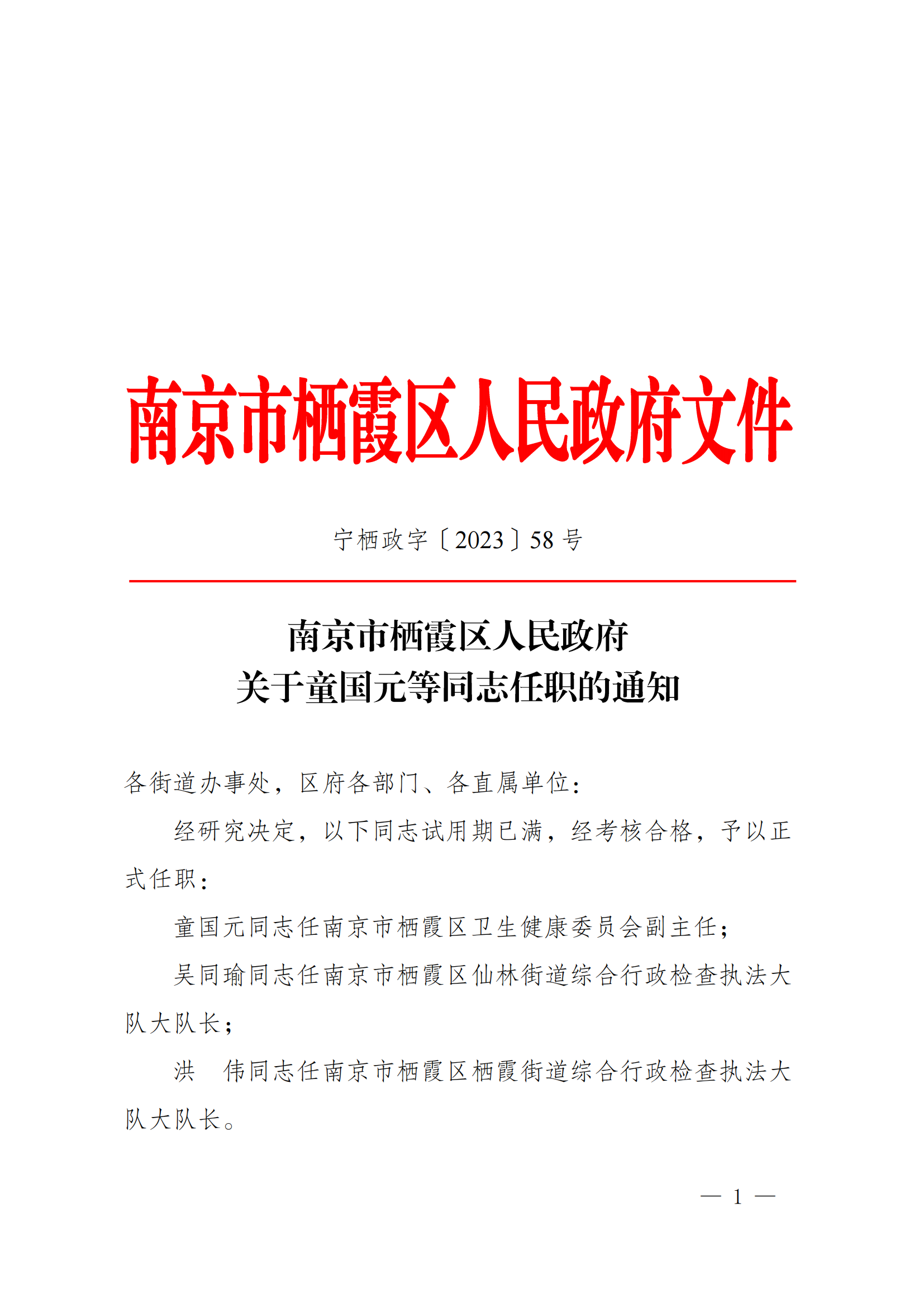 寧棲政字〔2023〕58號 南京市棲霞區人民政府關于童國元等同志任職的通知