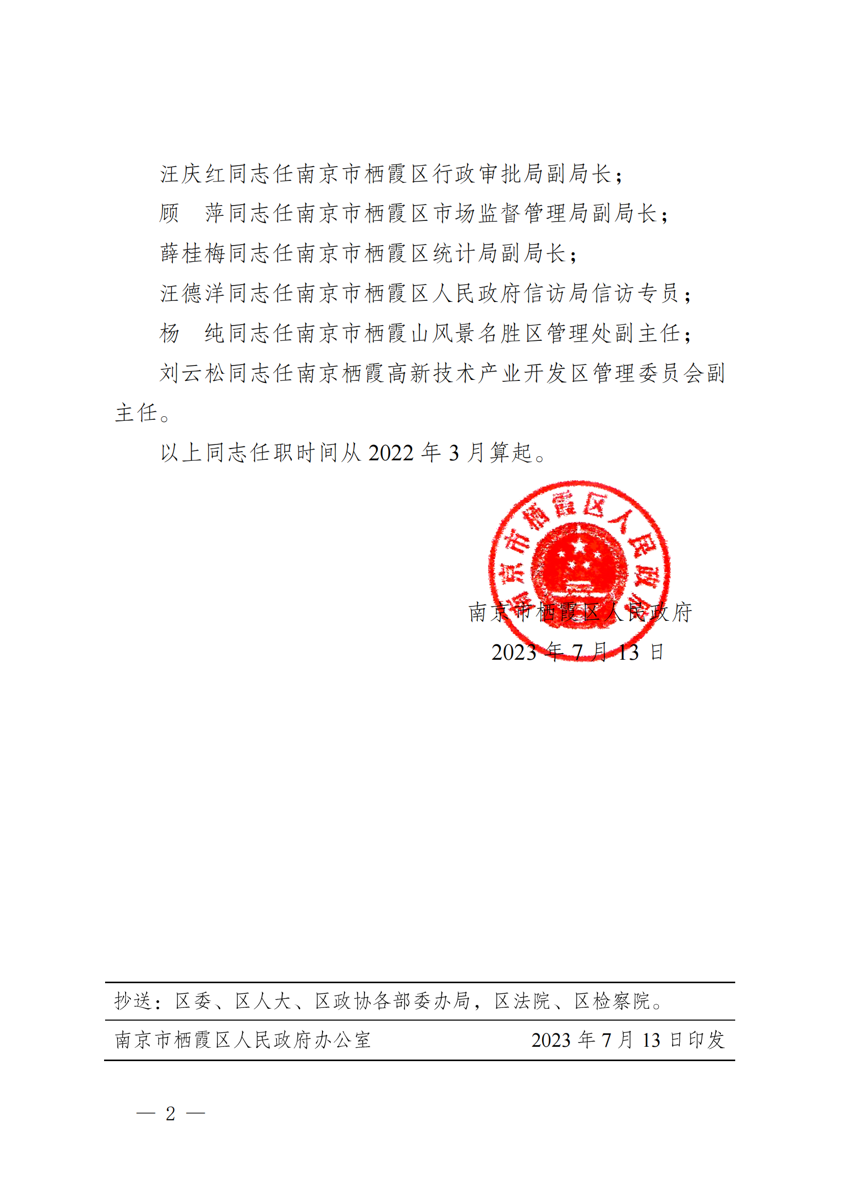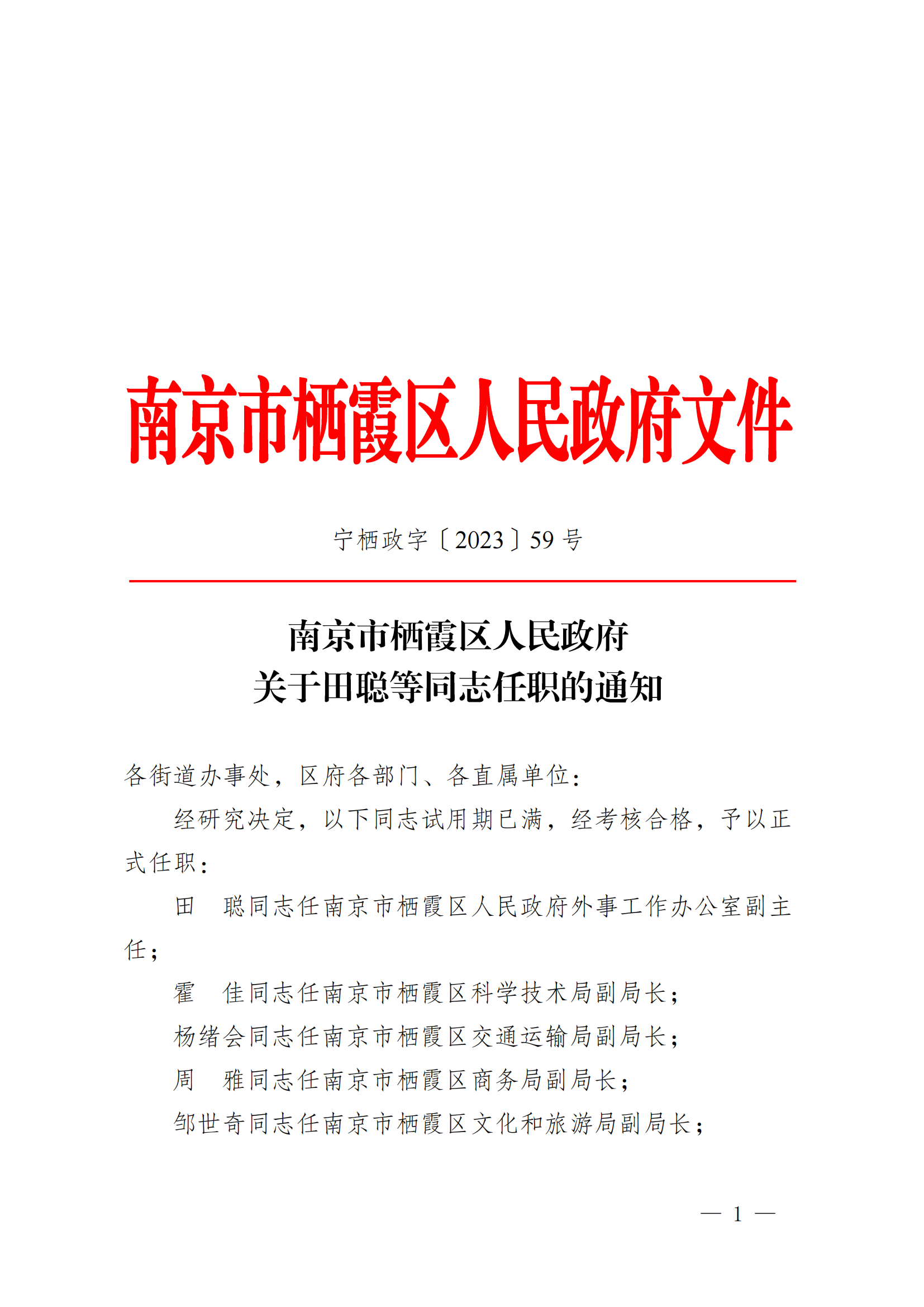 寧棲政字〔2023〕59號 南京市棲霞區人民政府關于田聰等同志任職的通知