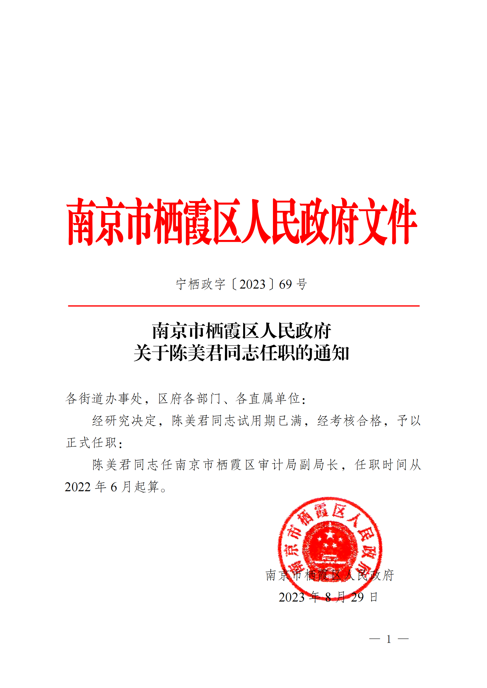 寧棲政字〔2023〕69號(hào) 南京市棲霞區(qū)人民政府關(guān)于陳美君同志任職的通知