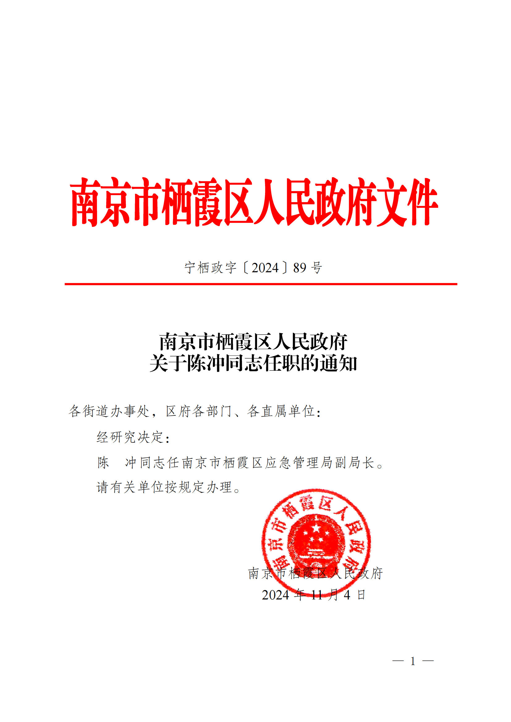 寧棲政字〔2024〕89號 南京市棲霞區人民政府關于陳沖同志任職的通知