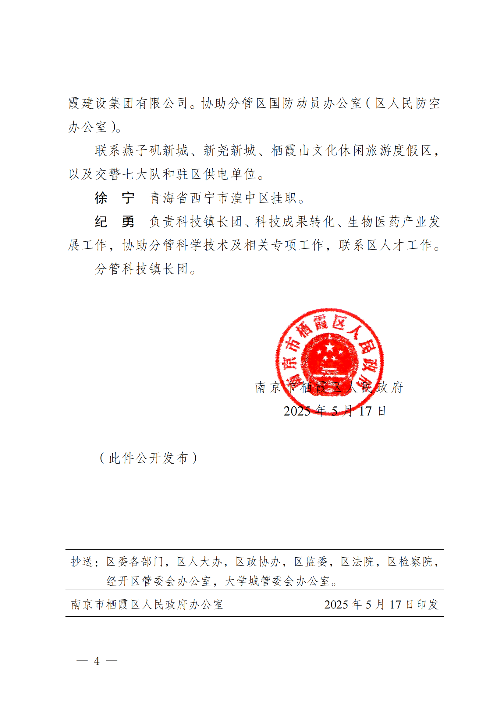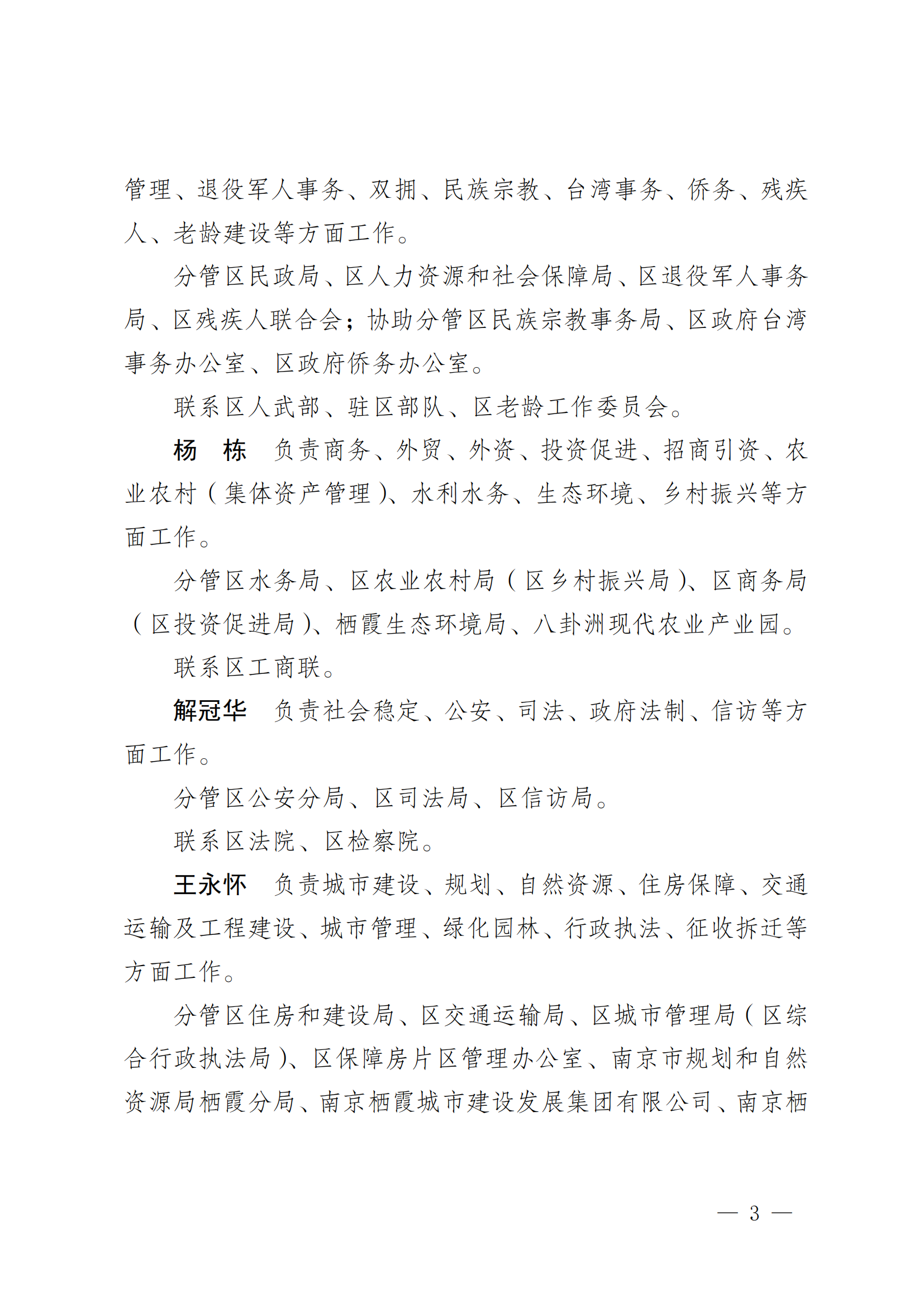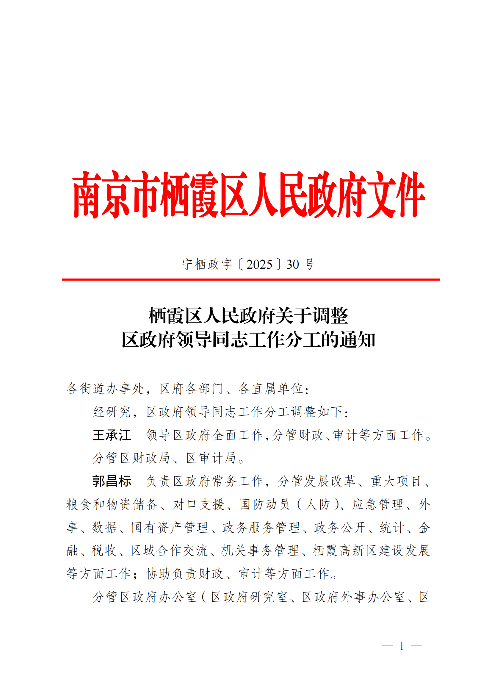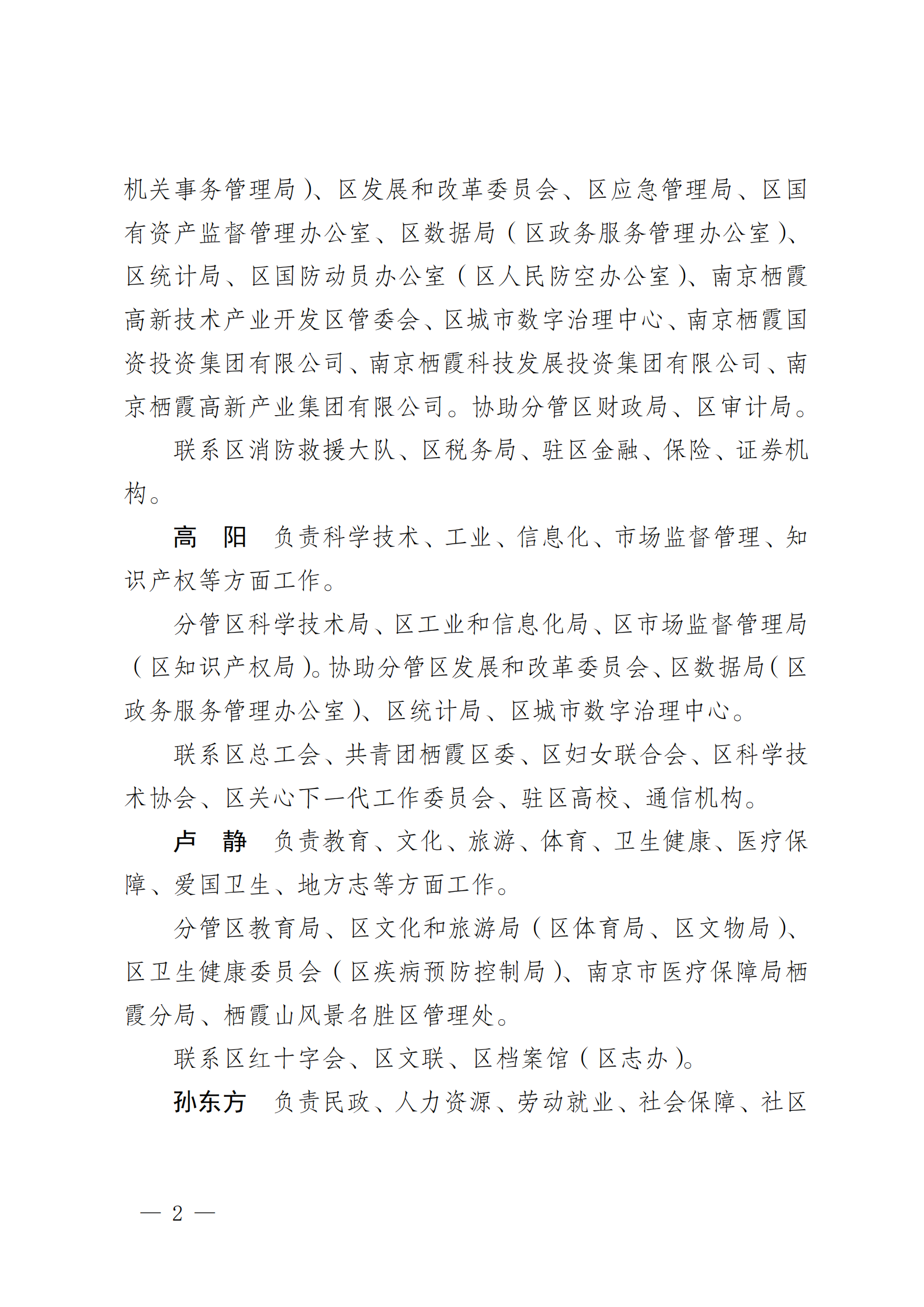 棲霞區人民政府關于調整區政府領導同志工作分工的通知