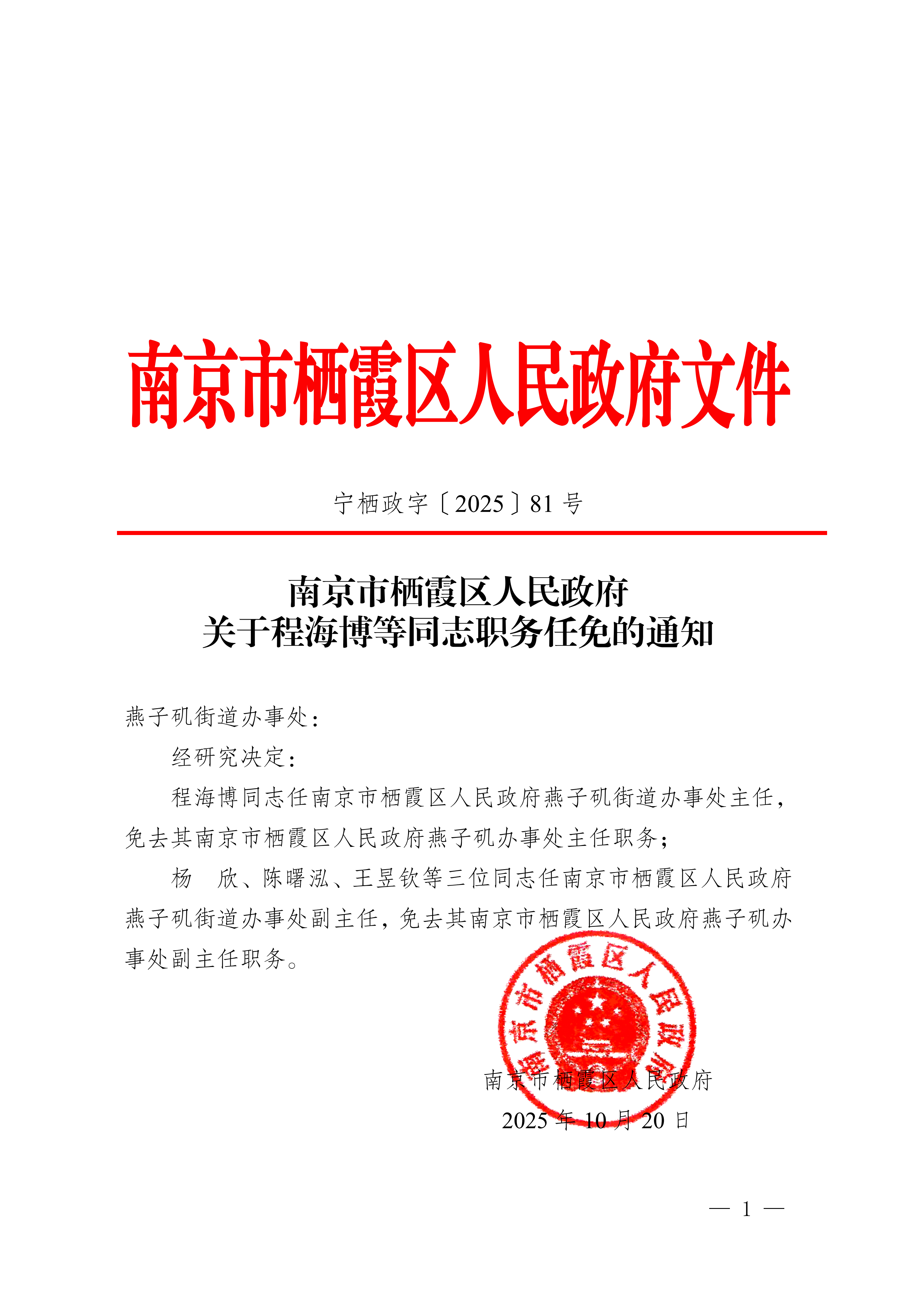 寧棲政字〔2025〕81號 南京市棲霞區人民政府關于程海博等同志職務任免的通知