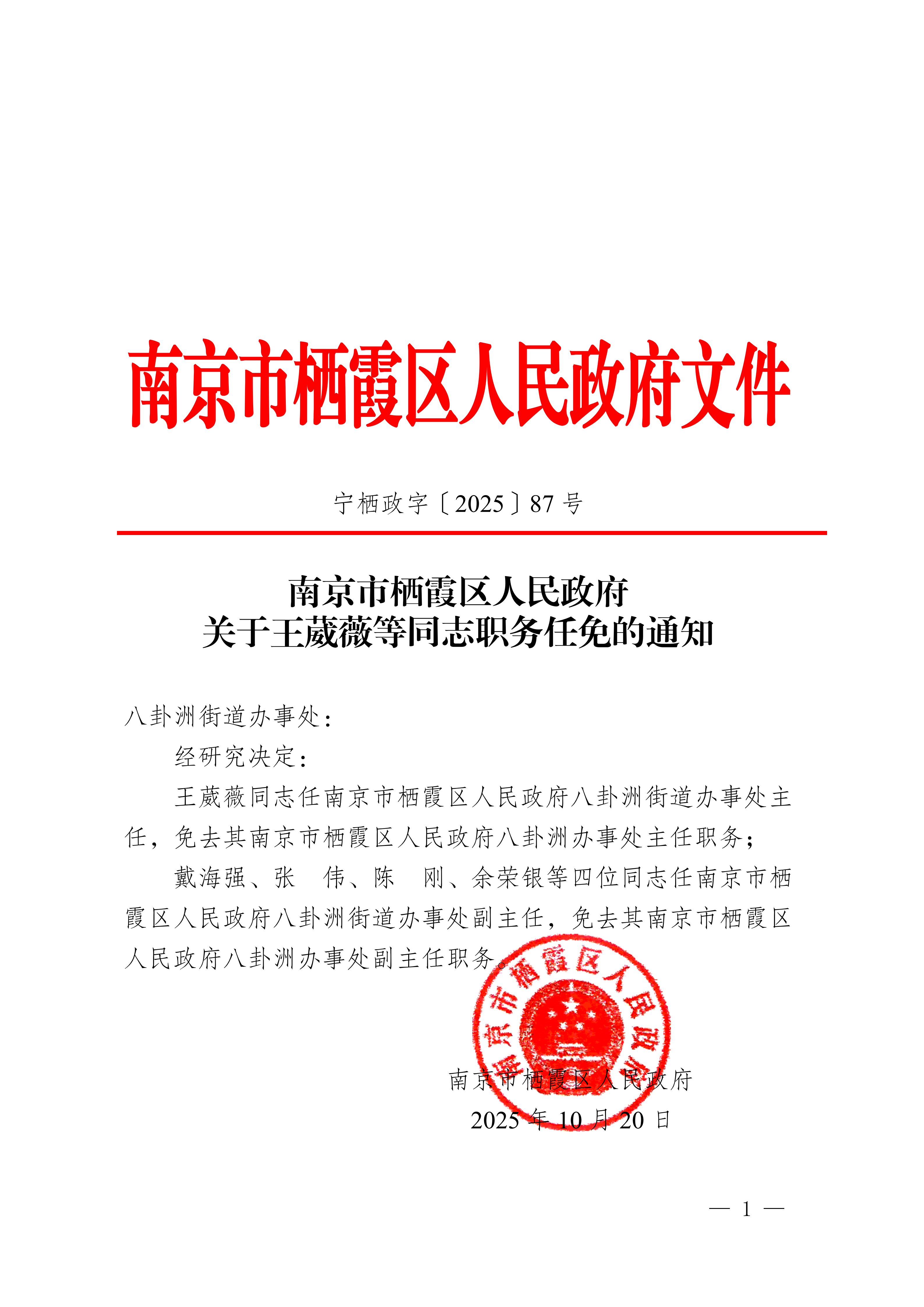 寧棲政字〔2025〕87號(hào) 南京市棲霞區(qū)人民政府關(guān)于王葳薇等同志職務(wù)任免的通知