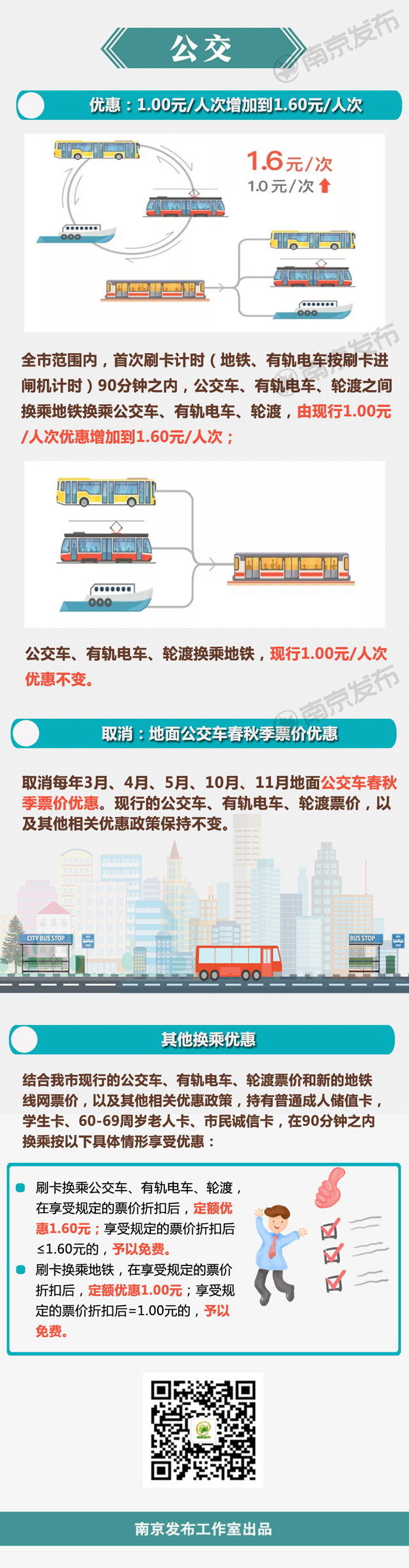 南京自2014年8月1日起,實施公共交通換乘優惠政策,刷卡乘坐公交車、有軌電車、輪渡、地鐵,90分鐘之內,換乘優惠0.40元/人次;2017年8月1日起,90分鐘之內,換乘優惠由0.40元/人次增加到1.00元/人次。