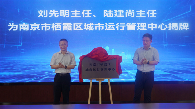 棲霞區委編辦主任劉先明、棲霞區發改委主任陸建尚為“南京市棲霞區城市運行管理中心”揭牌