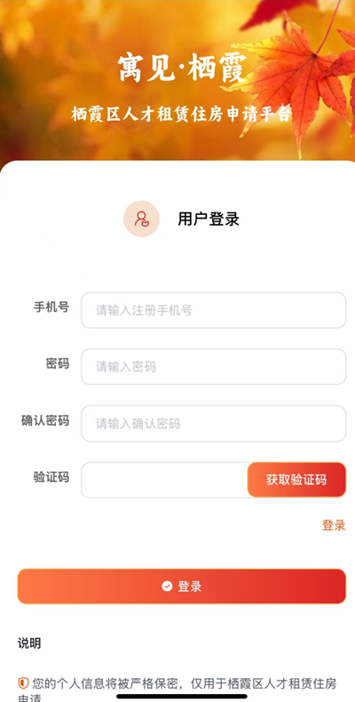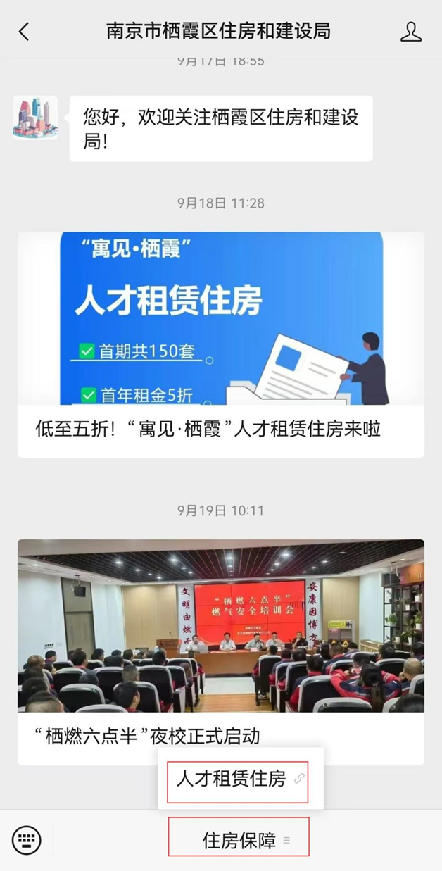 1. 申請人搜索并關注“棲霞區住房和建設局”公眾號,點擊“住房保障”,進入“人才租賃住房”小程序線上申請,申請人首次申請需注冊并登錄。