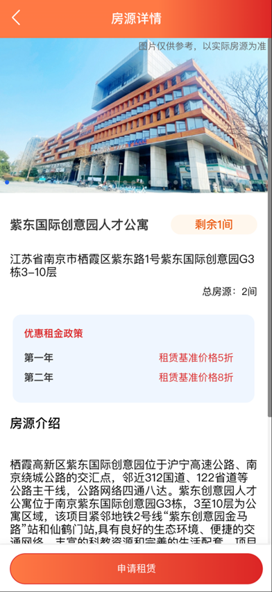 申請人搜索并關注“棲霞區住房和建設局”公眾號,點擊“住房保障”,進入“人才租賃住房”小程序線上申請,在申請頁面可查看房源基本信息,包含房源戶型實景、基礎配套圖片(照片僅供參考,房源以實際為準)、每種套型房源的租賃面積、租金標準等;申請人填寫個人基本信息并上傳相關附件資料,確認無誤后選擇有意向的房源后點擊申請入住即可。
