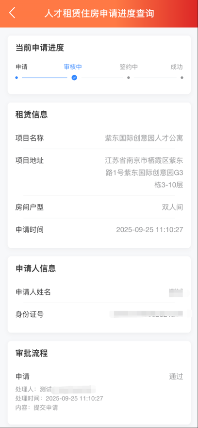 5. 提交申請后,在“我的申請”中可實時查看審核進度,人才租賃住房運營管理單位原則上1個工作日內完成審核并通知符合條件的申請人簽約入住。